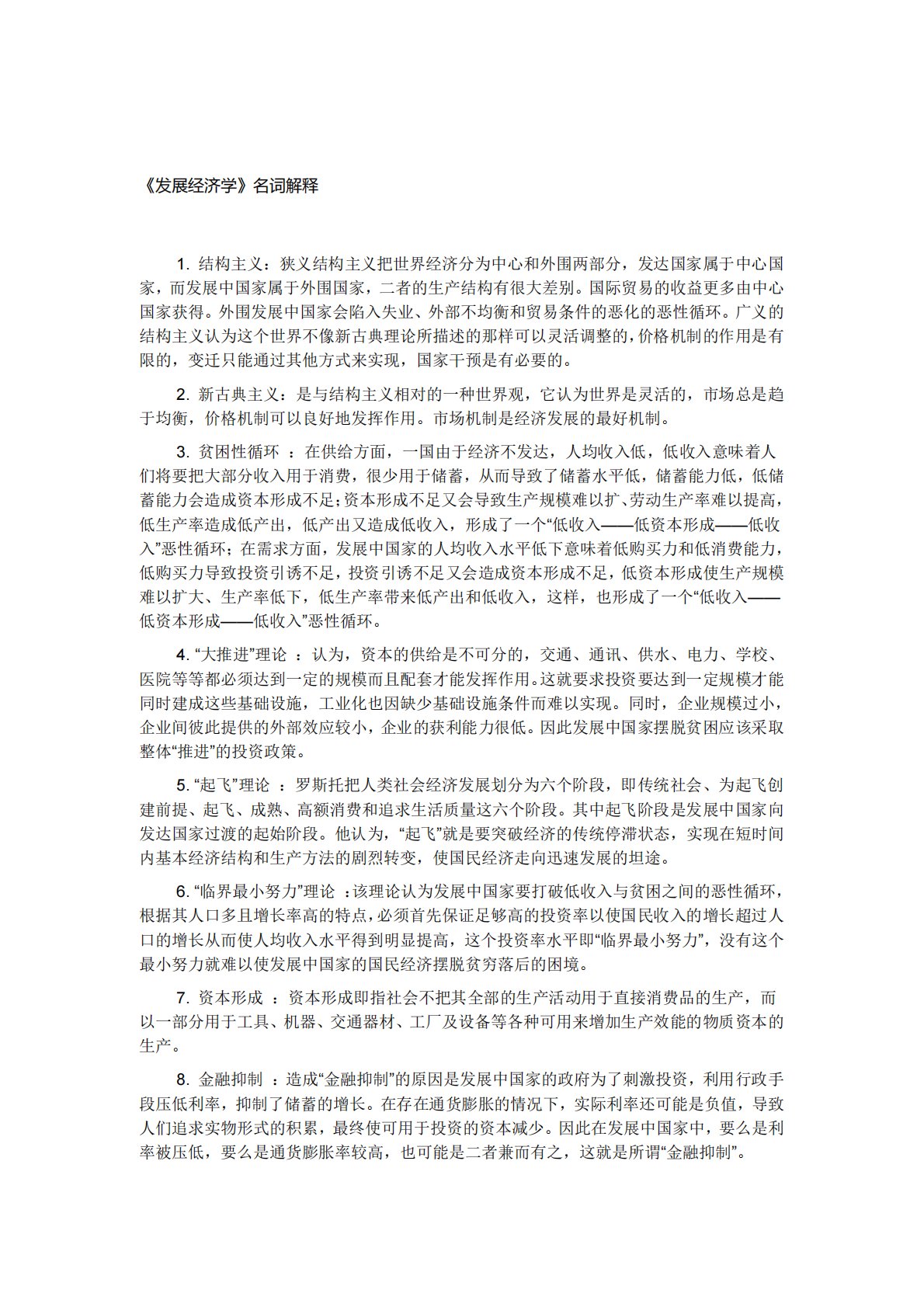《发展经济学》名词解释1.结构主义:狭义结构主义把世界经济分为中心和外围两部分,发达国家属于中心国家,而发展中国家属于外围国家,二者的生产结构有很大差别。国际贸易的收益更多由中心国家获得。外围发展中国家会陷入失业、外部不均衡和贸易条件的恶化的恶性循环。广义的结构主义认为这个世界不像新古典理论所描述的那样可以灵活调整的,价格机制的作用是有限的,变迁只能通过其他方式来实现,国家干预是有必要的。2.新古典主义:是与结构主义相对的一种世界观,它认为世界是灵活的,市场总是趋于均衡,价格机制可以良好地发挥作用。市场机制是经济发展的最好机制。3.贫困性循环:在供给方面,一国由于经济不发达,人均收入低,低收入...