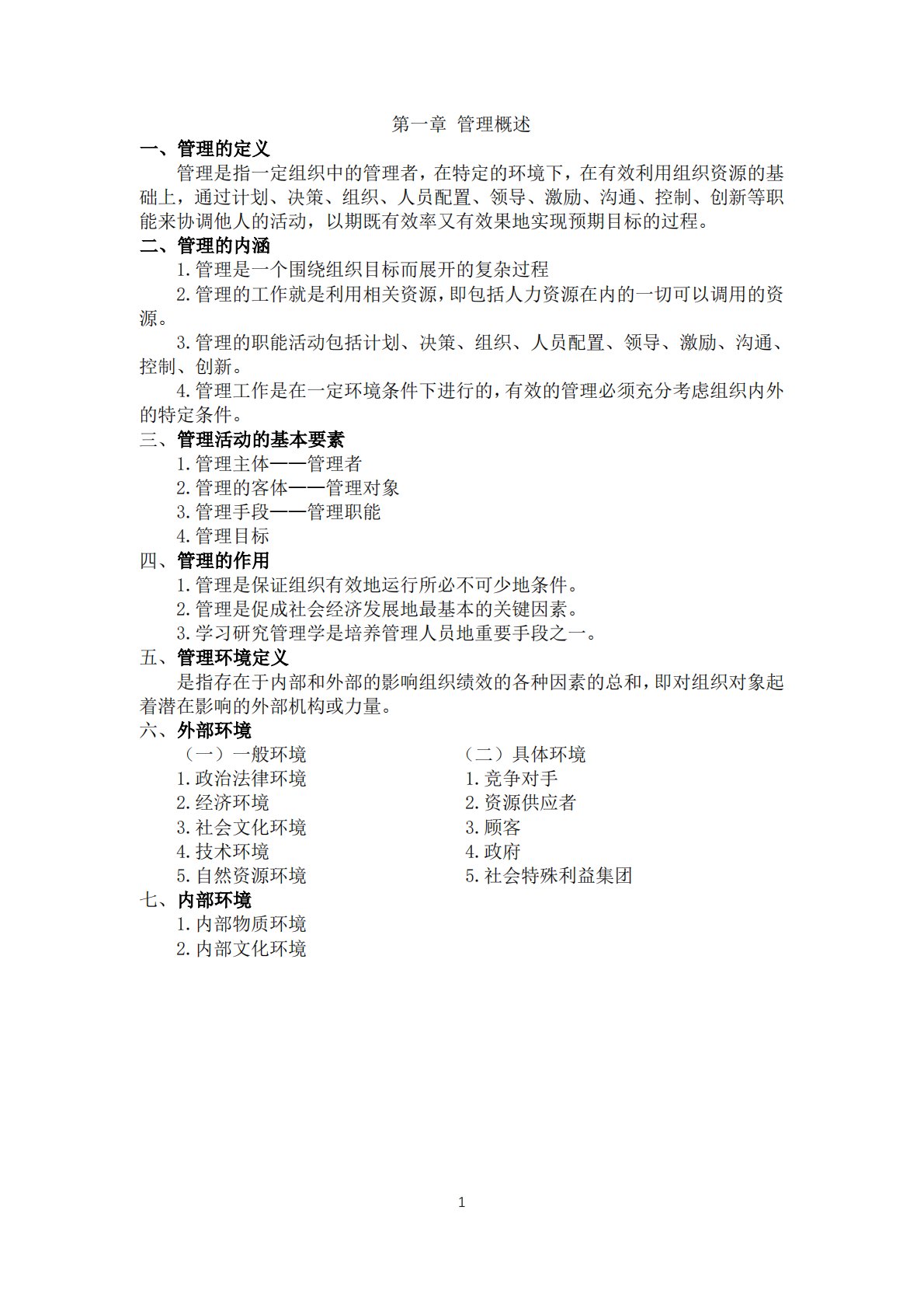 1第一章管理概述一、管理的定义管理是指一定组织中的管理者,在特定的环境下,在有效利用组织资源的基础上,通过计划、决策、组织、人员配置、领导、激励、沟通、控制、创新等职能来协调他人的活动,以期既有效率又有效果地实现预期目标的过程。二、管理的内涵1.管理是一个围绕组织目标而展开的复杂过程2.管理的工作就是利用相关资源,即包括人力资源在内的一切可以调用的资源。3.管理的职能活动包括计划、决策、组织、人员配置、领导、激励、沟通、控制、创新。4.管理工作是在一定环境条件下进行的,有效的管理必须充分考虑组织内外的特定条件。三、管理活动的基本要素1.管理主体——管理者2.管理的客体——管理对象3.管理手段—...