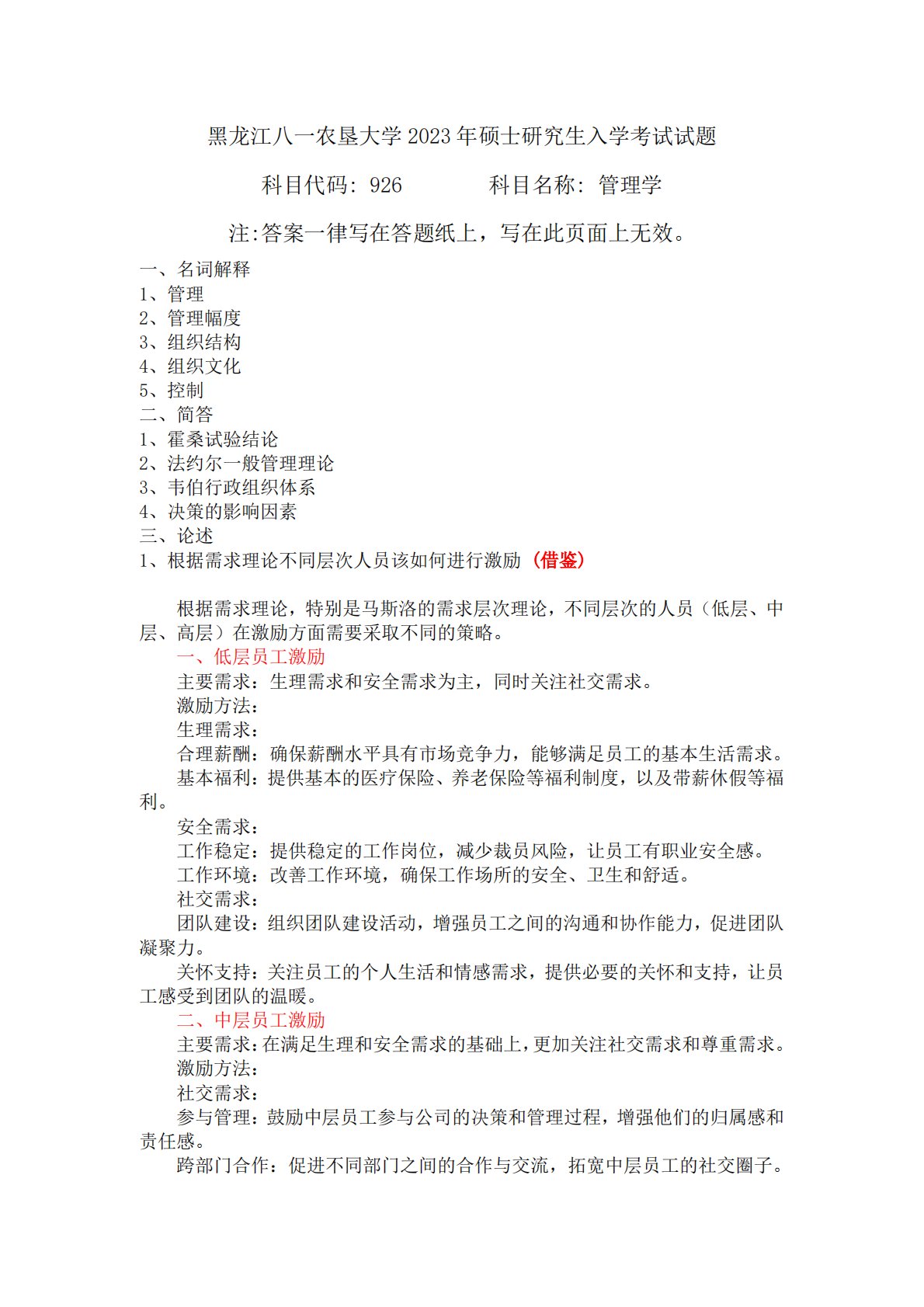 黑龙江八一农垦大学2023年硕士研究生入学考试试题科目代码:926科目名称:管理学注:答案一律写在答题纸上,写在此页面上无效。一、名词解释1、管理2、管理幅度3、组织结构4、组织文化5、控制二、简答1、霍桑试验结论2、法约尔一般管理理论3、韦伯行政组织体系4、决策的影响因素三、论述1、根据需求理论不同层次人员该如何进行激励(借鉴)根据需求理论,特别是马斯洛的需求层次理论,不同层次的人员(低层、中层、高层)在激励方面需要采取不同的策略。一、低层员工激励主要需求:生理需求和安全需求为主,同时关注社交需求。激励方法:生理需求:合理薪酬:确保薪酬水平具有市场竞争力,能够满足员工的基本生活需求。基本福利...