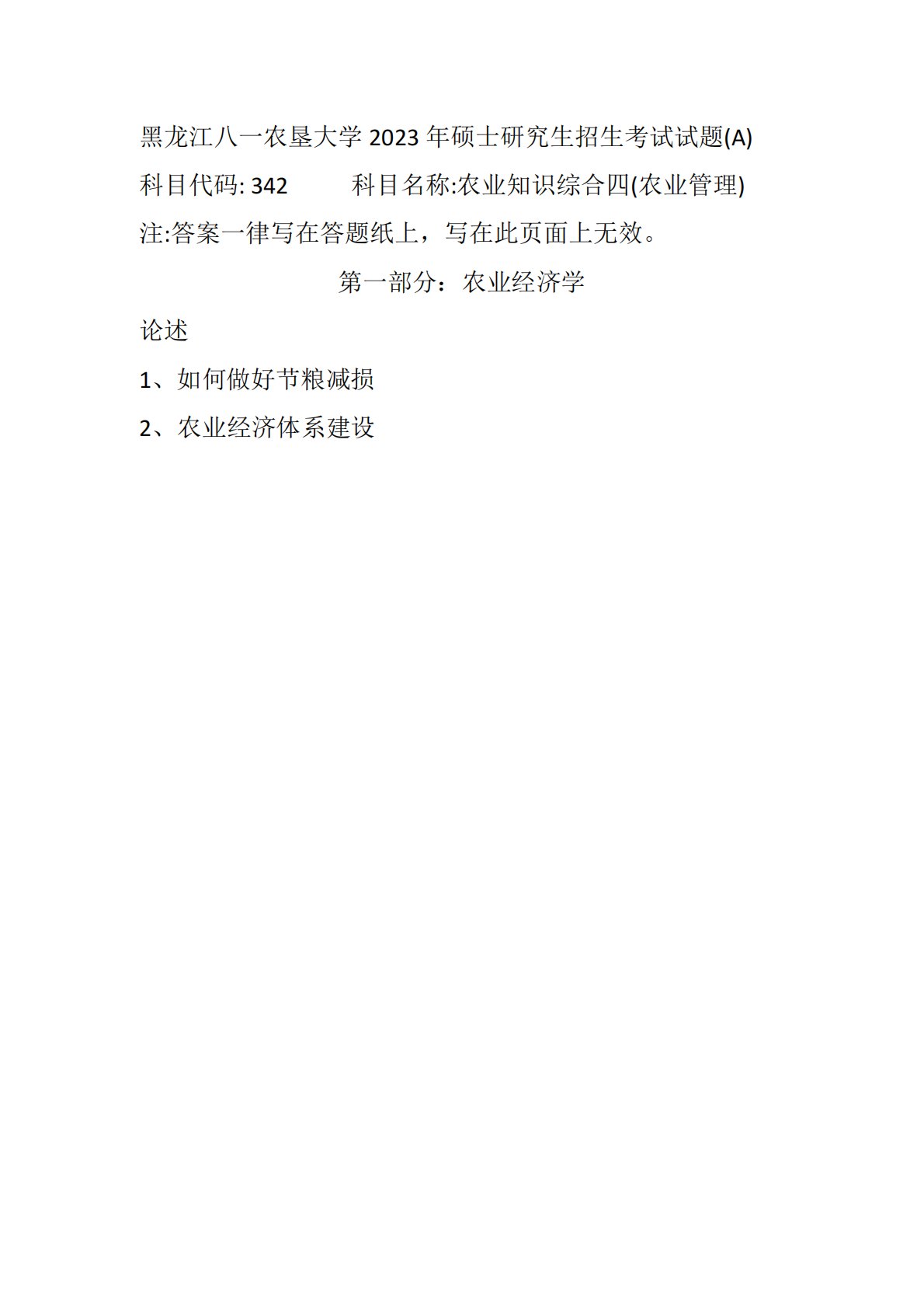 黑龙江八一农垦大学2023年硕士研究生招生考试试题(A)科目代码:342科目名称:农业知识综合四(农业管理)注:答案一律写在答题纸上,写在此页面上无效。第一部分:农业经济学论述1、如何做好节粮减损2、农业经济体系建设黑龙江八一农垦大学2023年硕士研究生招生考试试题(A)科目代码:342科目名称:农业知识综合四(农业管理)注:答案一律写在答题纸上,写在此页面上无效。第一部分:农业经济学论述1、如何做好节粮减损2、农业经济体系建设第二部分:农业政策学论述1、如何打好种业大战(中央一号)2、流通政策目标和手段有哪些(材料)第三部分:农业社会学论述1、如何完善乡村治理(中央一号)2、选调生等在乡村振...