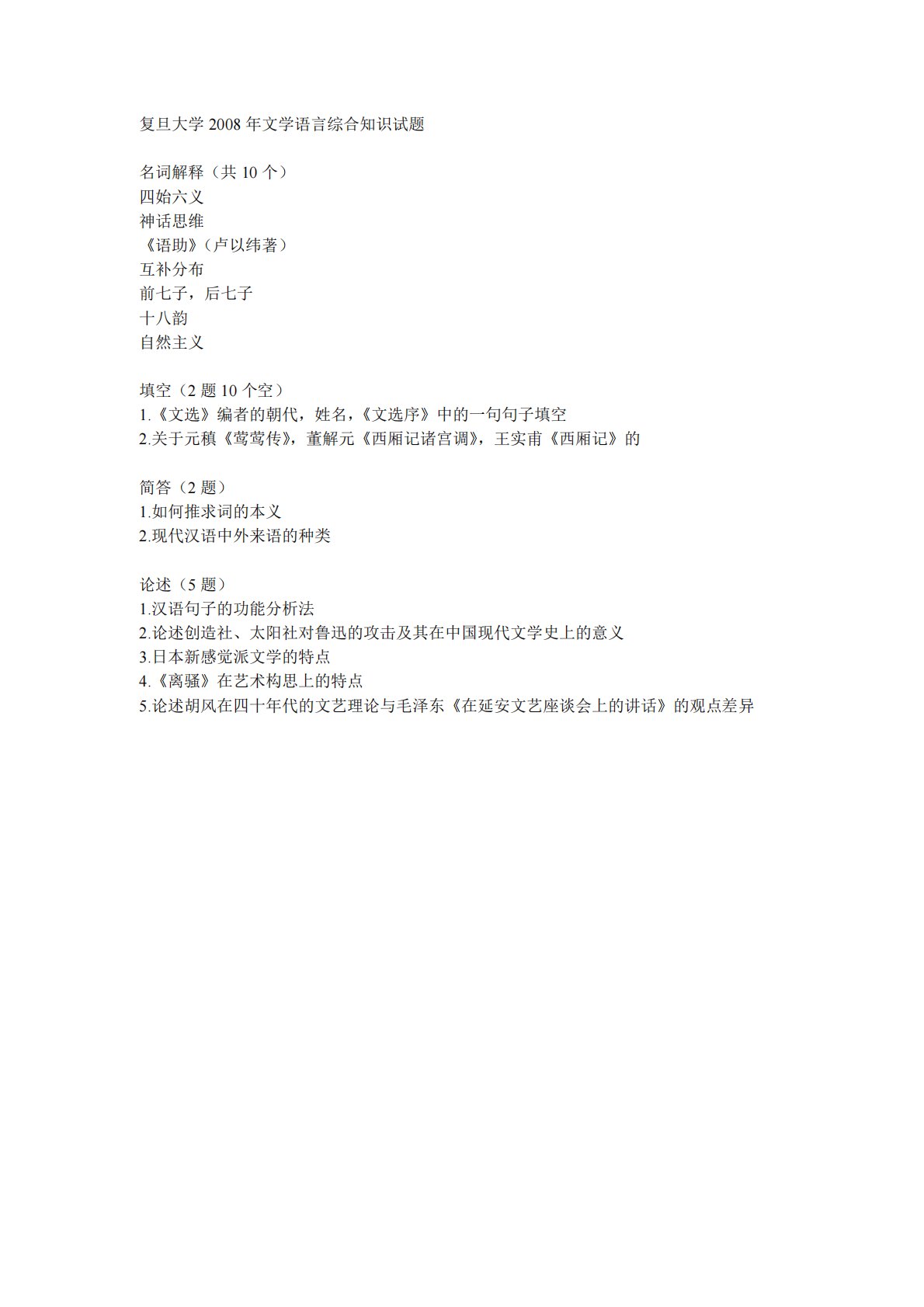 复旦大学705文学语言综合知识2008年真题