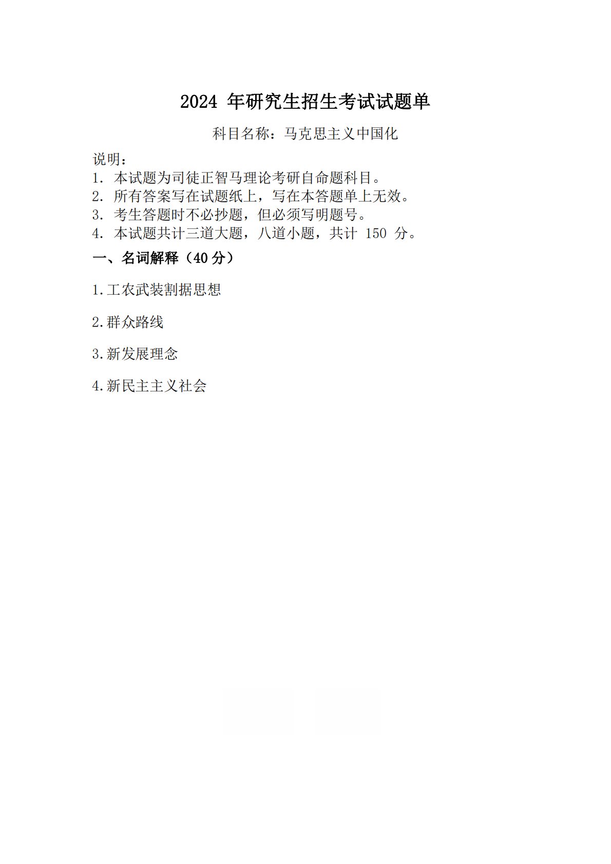 2024年研究生招生考试试题单科目名称:马克思主义中国化说明:1.本试题为司徒正智马理论考研自命题科目。2.所有答案写在试题纸上,写在本答题单上无效。3.考生答题时不必抄题,但必须写明题号。4.本试题共计三道大题,八道小题,共计150分。一、名词解释(40分)1.工农武装割据思想2.群众路线3.新发展理念4.新民主主义社会2024年研究生招生考试试题单科目名称:马克思主义中国化说明:1.本试题为司徒正智马理论考研自命题科目。2.所有答案写在试题纸上,写在本答题单上无效。3.考生答题时不必抄题,但必须写明题号。4.本试题共计三道大题,八道小题,共计150分。一、名词解释(40分)1.工农武装割据...