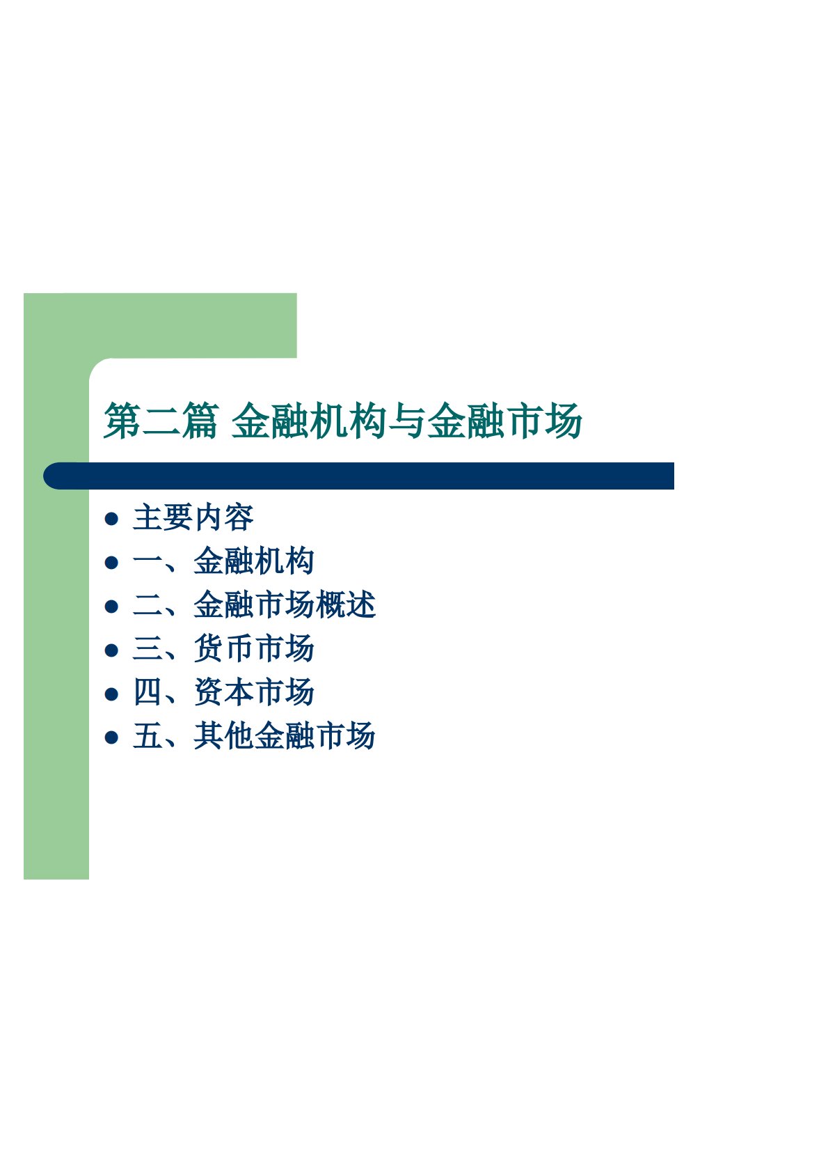 第二篇金融机构与金融市场l主要内容l一、金融机构l二、金融市场概述l三、货币市场l四、资本市场l五、其他金融市场一、金融机构l(一)金融机构的含义l狭义的金融机构仅指那些通过参与或服务金融市场交易而获取收益的金融企业;l广义的金融机构则不仅包括所有从事金融活动的组织,而且包括金融市场的监管者,如中央银行等以及国际金融机构。金融机构分类:从理论上的分类金融机构体系非银行金融体系银行体系中央银行专业银行商业银行其他投资基金证券公司保险公司银行体系l中央银行是代表政府调控经济、管理金融的特殊金融机构,是金融体系的核心:政府的银行,银行的银行,发行的银行。l商业银行是吸收公众存款,发放贷款,办理结算等...