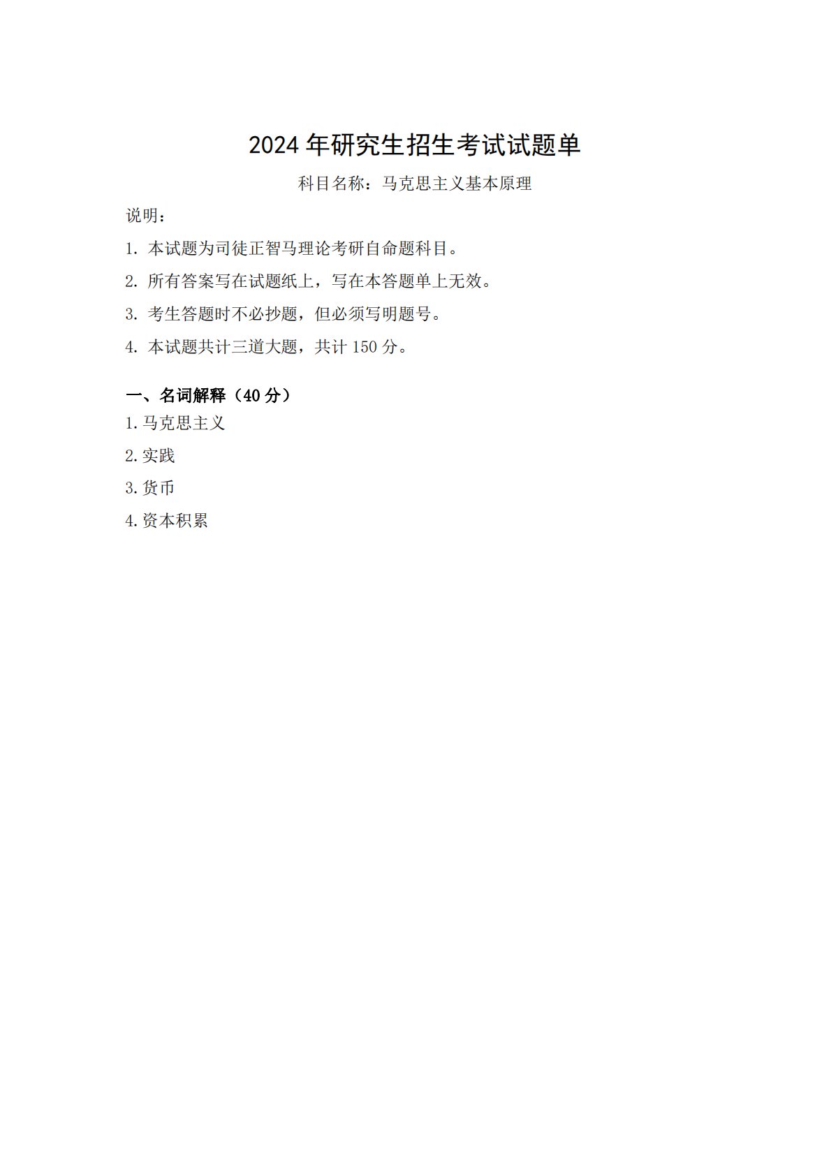 2024年研究生招生考试试题单科目名称:马克思主义基本原理说明:1.本试题为司徒正智马理论考研自命题科目。2.所有答案写在试题纸上,写在本答题单上无效。3.考生答题时不必抄题,但必须写明题号。4.本试题共计三道大题,共计150分。一、名词解释(40分)1.马克思主义2.实践3.货币4.资本积累2024年研究生招生考试试题单科目名称:马克思主义基本原理说明:1.本试题为司徒正智马理论考研自命题科目。2.所有答案写在试题纸上,写在本答题单上无效。3.考生答题时不必抄题,但必须写明题号。4.本试题共计三道大题,共计150分。一、名词解释(40分)1.马克思主义2.实践3.货币4.资本积累5.意识形态...