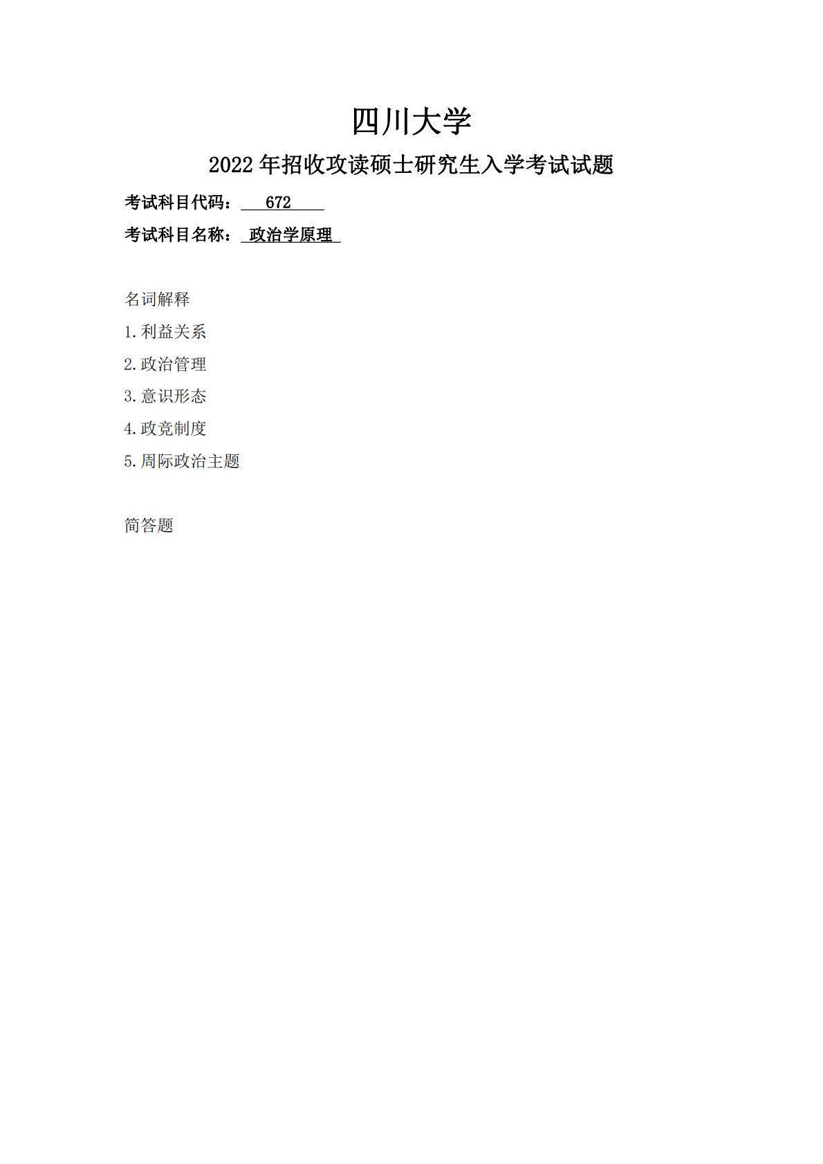 四川大学2022年招收攻读硕士研究生入学考试试题考试科目代码:672考试科目名称:政治学原理名词解释1.利益关系2.政治管理3.意识形态4.政竞制度5.周际政治主题简答题四川大学2022年招收攻读硕士研究生入学考试试题考试科目代码:672考试科目名称:政治学原理名词解释1.利益关系2.政治管理3.意识形态4.政竞制度5.周际政治主题简答题1.简速马充恩主义政治学研究的基本方法2.简速政治社团在政治生活中的作用方式3.简还政治统治的特点4.简速资本主义压力集团的特征5.简速经济全球在对国际政治和全球治理的影响论述题1.试述政治文在的特征及具功能作用2.请用政治学相关理论,阐释政治民主在政治生话中...