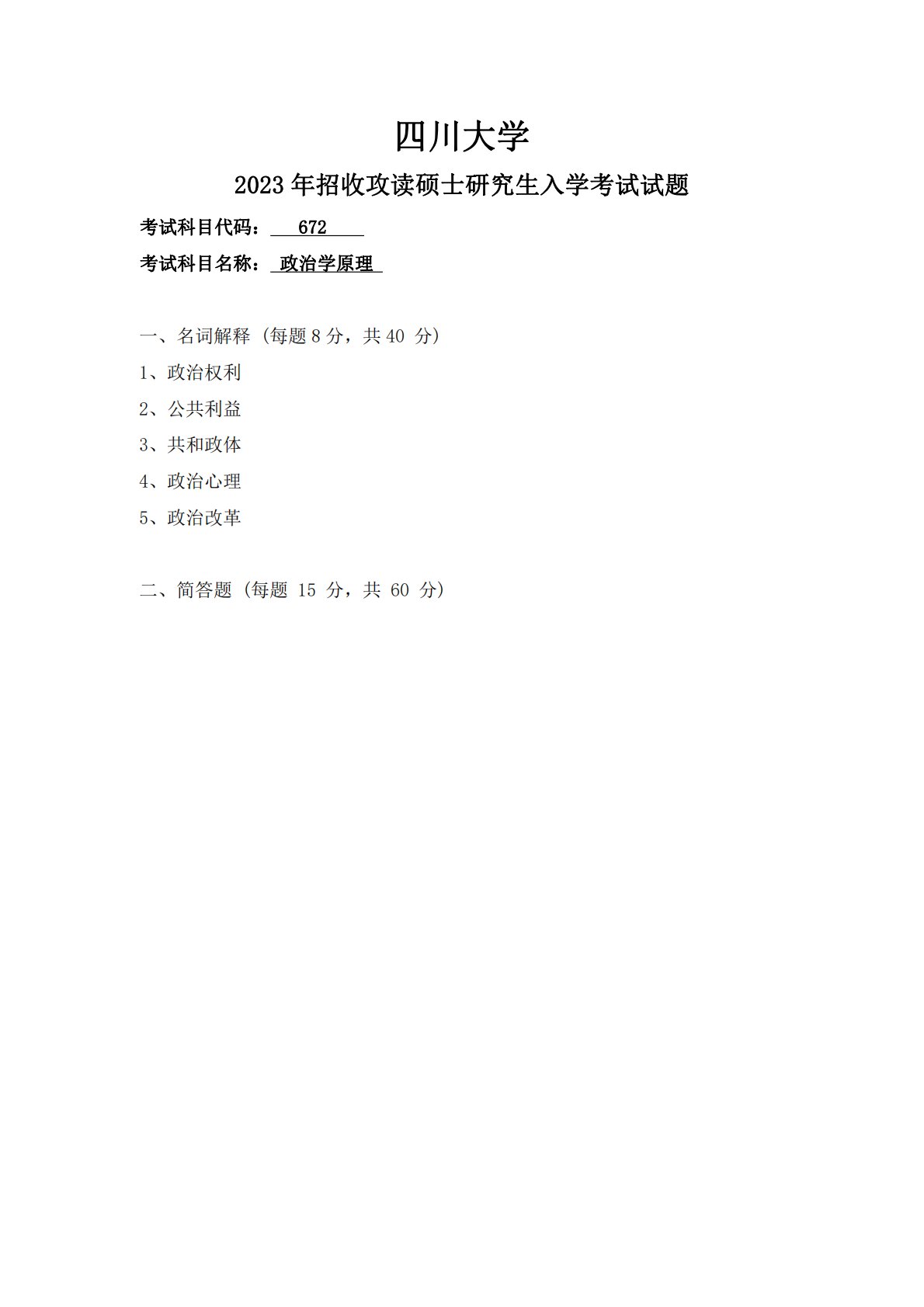 四川大学672政治学原理2023年真题
