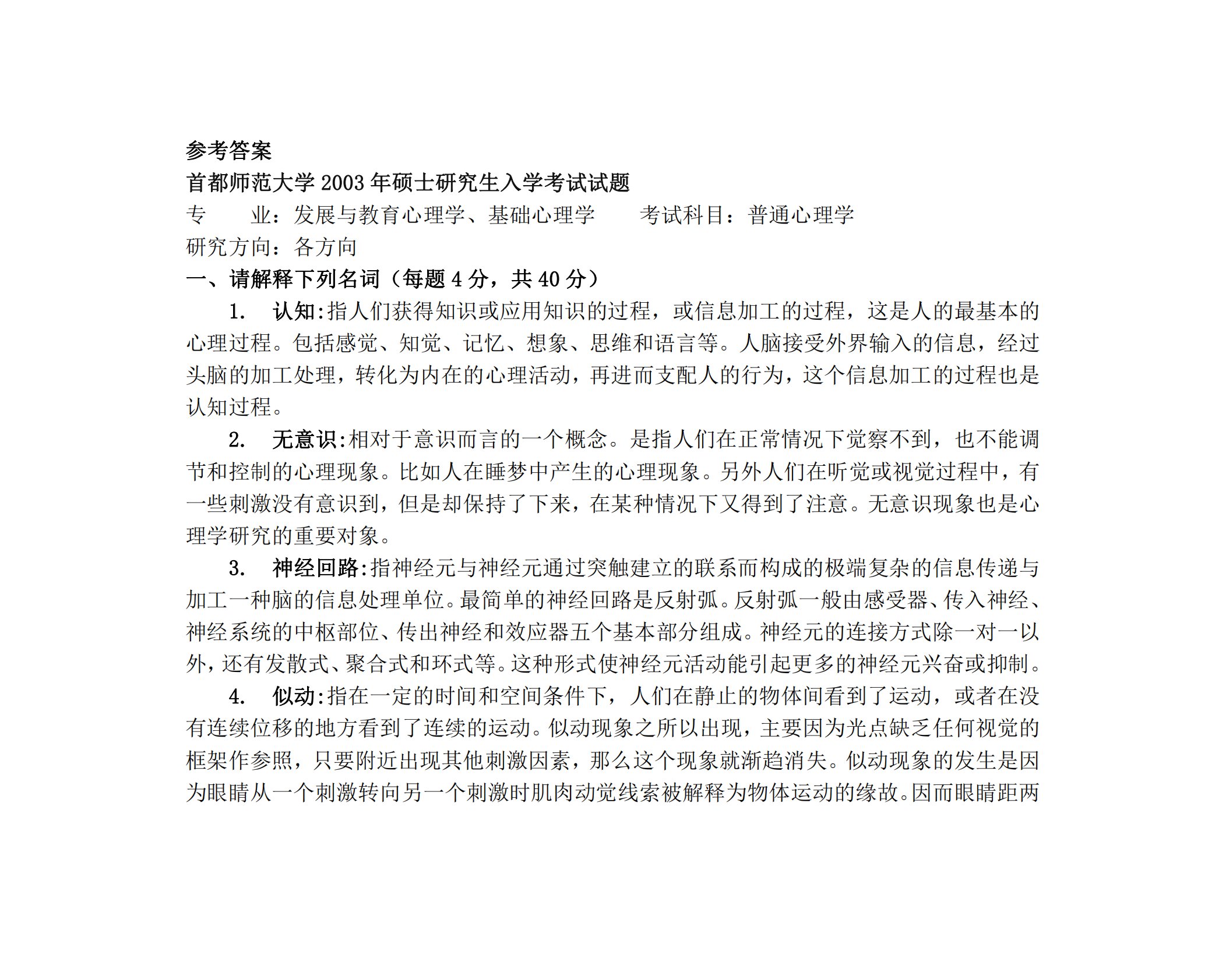 参考答案首都师范大学2003年硕士研究生入学考试试题专业:发展与教育心理学、基础心理学考试科目:普通心理学研究方向:各方向一、请解释下列名词(每题4分,共40分)1.认知:指人们获得知识或应用知识的过程,或信息加工的过程,这是人的最基本的心理过程。包括感觉、知觉、记忆、想象、思维和语言等。人脑接受外界输入的信息,经过头脑的加工处理,转化为内在的心理活动,再进而支配人的行为,这个信息加工的过程也是认知过程。2.无意识:相对于意识而言的一个概念。是指人们在正常情况下觉察不到,也不能调节和控制的心理现象。比如人在睡梦中产生的心理现象。另外人们在听觉或视觉过程中,有一些刺激没有意识到,但是却保持了下来...