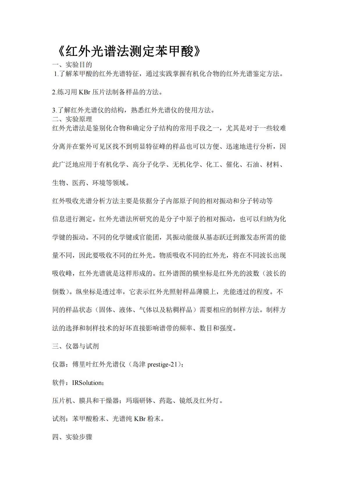 《红外光谱法测定苯甲酸》一、实验目的1.了解苯甲酸的红外光谱特征,通过实践掌握有机化合物的红外光谱鉴定方法。2.练习用KBr压片法制备样品的方法。3.了解红外光谱仪的结构,熟悉红外光谱仪的使用方法。二、实验原理红外光谱法是鉴别化合物和确定分子结构的常用手段之一,尤其是对于一些较难分离并在紫外可见区找不到明显特征峰的样品也可以方便、迅速地进行分析,因此广泛地应用于有机化学、高分子化学、无机化学、化工、催化、石油、材料、生物、医药、环境等领域。红外吸收光谱分析方法主要是依据分子内部原子间的相对振动和分子转动等信息进行测定。红外光谱法所研究的是分子中原子的相对振动,也可以归纳为化学键的振动。不同的化...