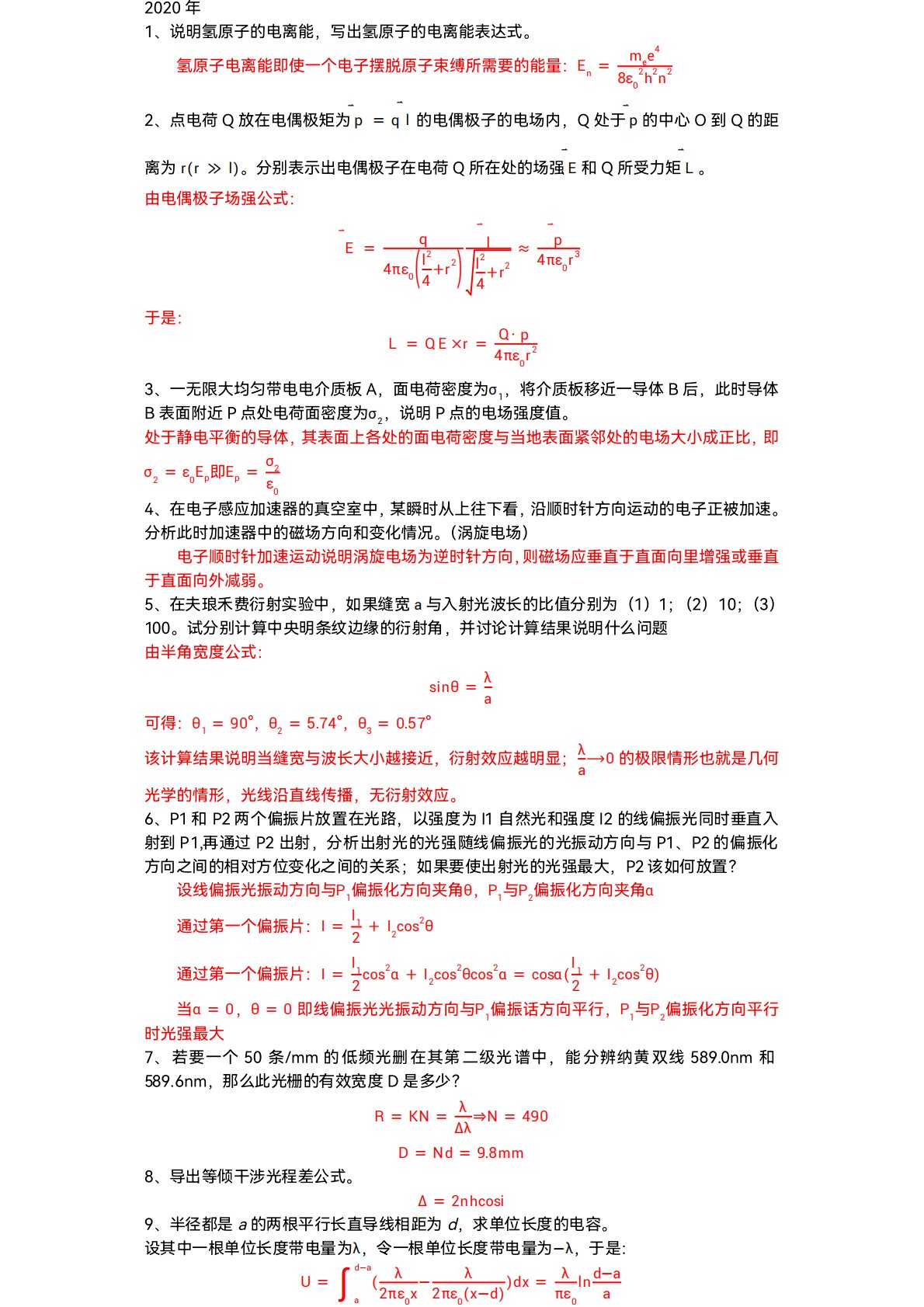 2020年1、说明氢原子的电离能,写出氢原子的电离能表达式。氢原子电离能即使一个电子摆脱原子束缚所需要的能量:En=mee48ε02ℎ2n22、点电荷Q放在电偶极矩为⃑p=q⃑l的电偶极子的电场内,Q处于⃑p的中心O到Q的距离为r(r≫l)。分别表示出电偶极子在电荷Q所在处的场强⃑E和Q所受力矩⃑L。由电偶极子场强公式:⃑E=q4πε0(l24+r2)⃑ll24+r2≈⃑p4πε0r3于是:⃑L=Q⃑E×r=Q·⃑p4πε0r23、一无限大均匀带电电介质板A,面电荷密度为σ1,将介质板移近一导体B后,此时导体B表面附近P点处电荷面密度为σ2,说明P点的电场强度值。处于静电平衡的导体,其表面上各...