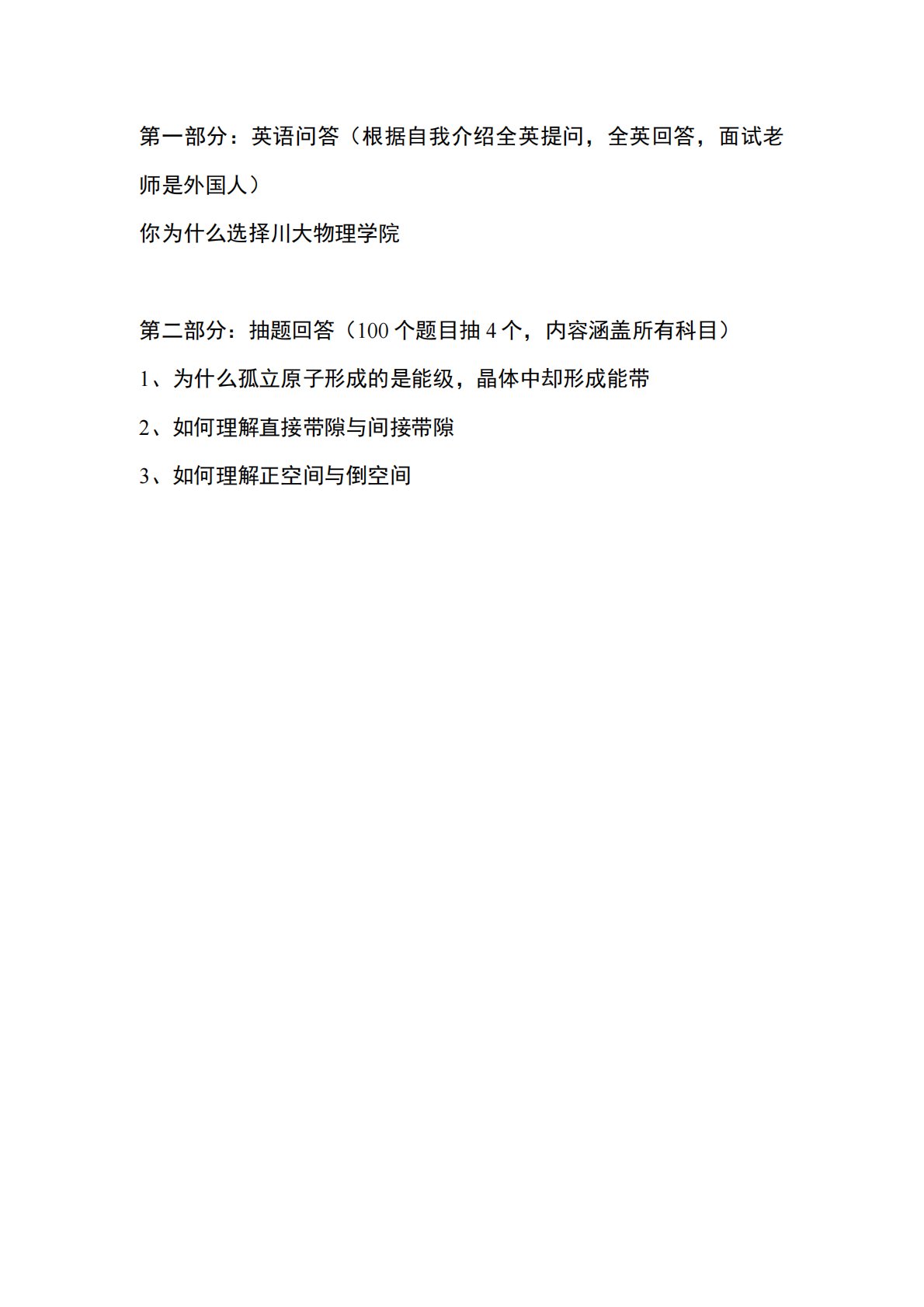 第一部分:英语问答(根据自我介绍全英提问,全英回答,面试老师是外国人)你为什么选择川大物理学院第二部分:抽题回答(100个题目抽4个,内容涵盖所有科目)1、为什么孤立原子形成的是能级,晶体中却形成能带2、如何理解直接带隙与间接带隙3、如何理解正空间与倒空间第一部分:英语问答(根据自我介绍全英提问,全英回答,面试老师是外国人)你为什么选择川大物理学院第二部分:抽题回答(100个题目抽4个,内容涵盖所有科目)1、为什么孤立原子形成的是能级,晶体中却形成能带2、如何理解直接带隙与间接带隙3、如何理解正空间与倒空间4、如何理解近自由电子近似和紧束缚近似5、如何理解能带、禁带6、如何理解夫琅禾费衍射第三...