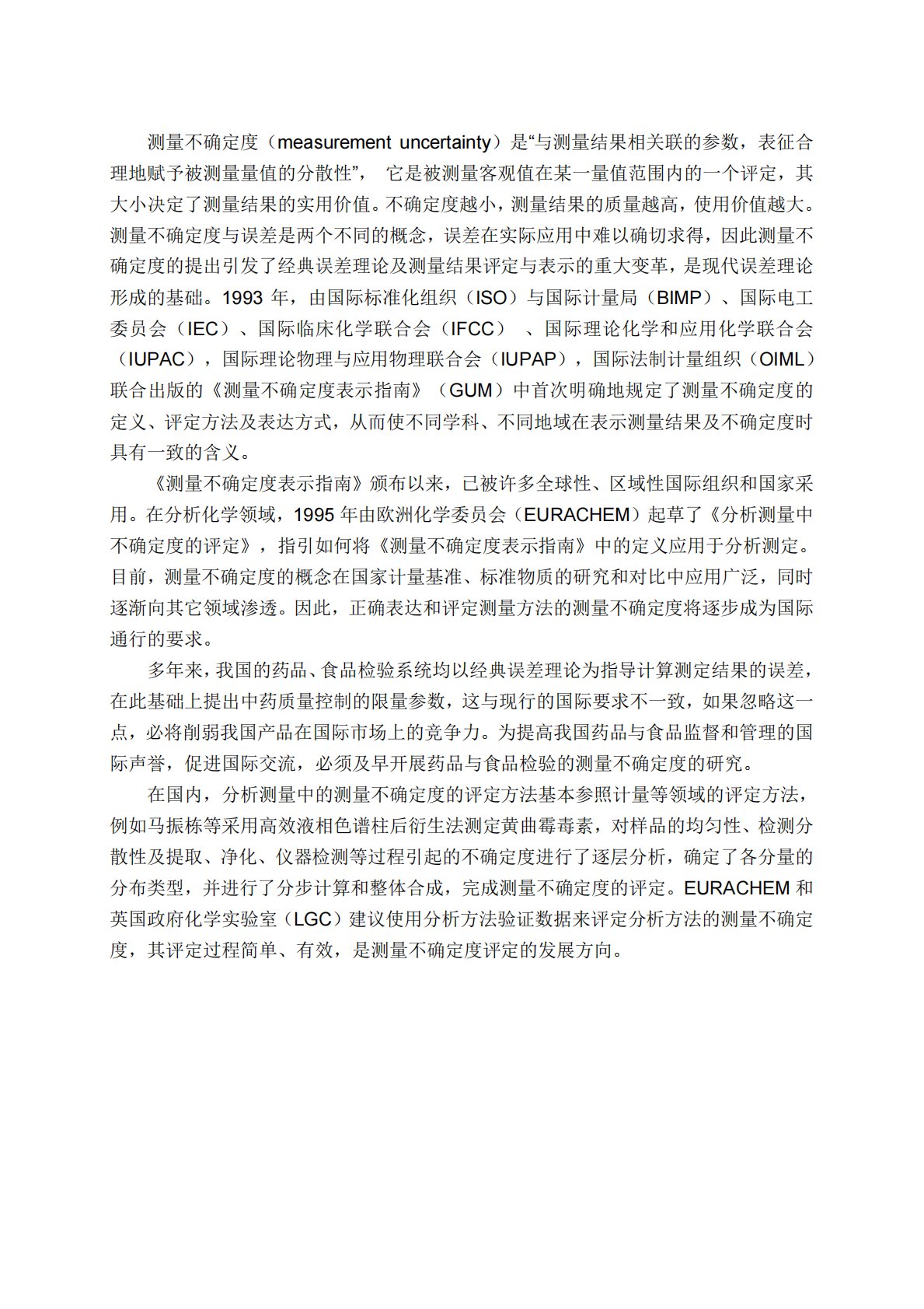 测量不确定度(measurementuncertainty)是“与测量结果相关联的参数,表征合理地赋予被测量量值的分散性”,它是被测量客观值在某一量值范围内的一个评定,其大小决定了测量结果的实用价值。不确定度越小,测量结果的质量越高,使用价值越大。测量不确定度与误差是两个不同的概念,误差在实际应用中难以确切求得,因此测量不确定度的提出引发了经典误差理论及测量结果评定与表示的重大变革,是现代误差理论形成的基础。1993年,由国际标准化组织(ISO)与国际计量局(BIMP)、国际电工委员会(IEC)、国际临床化学联合会(IFCC)、国际理论化学和应用化学联合会(IUPAC),国际理论物理与应用物理...