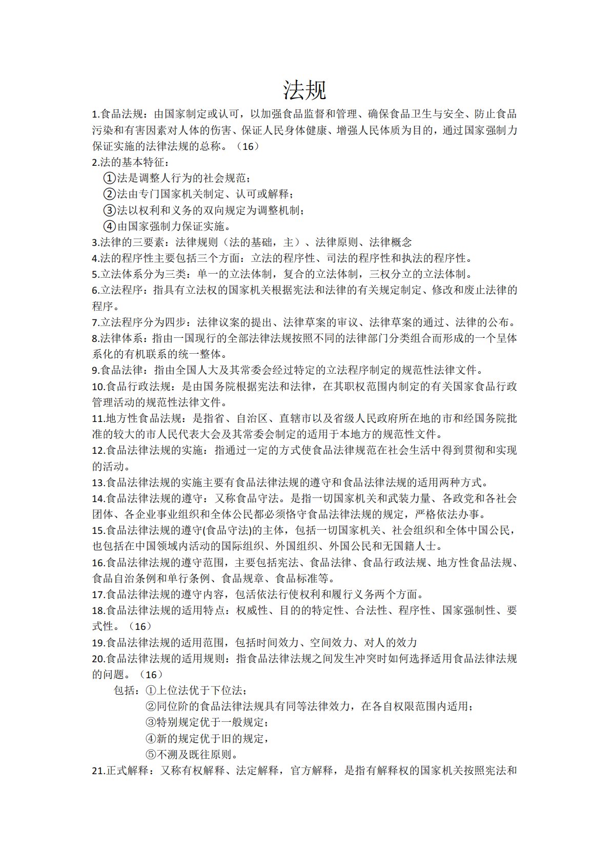 法规1.食品法规:由国家制定或认可,以加强食品监督和管理、确保食品卫生与安全、防止食品污染和有害因素对人体的伤害、保证人民身体健康、增强人民体质为目的,通过国家强制力保证实施的法律法规的总称。(16)2.法的基本特征:①法是调整人行为的社会规范;②法由专门国家机关制定、认可或解释;③法以权利和义务的双向规定为调整机制;④由国家强制力保证实施。3.法律的三要素:法律规则(法的基础,主)、法律原则、法律概念4.法的程序性主要包括三个方面:立法的程序性、司法的程序性和执法的程序性。5.立法体系分为三类:单一的立法体制,复合的立法体制,三权分立的立法体制。6.立法程序:指具有立法权的国家机关根据宪法和...