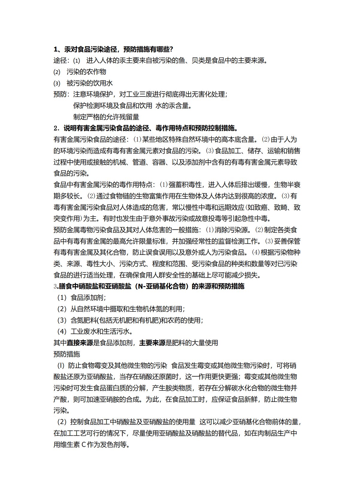 1、汞对食品污染途径,预防措施有哪些?途径:⑴进入人体的汞主要来自被污染的鱼、贝类是食品中的主要来源。⑵污染的农作物⑶被污染的饮用水预防:注意环境保护,对工业三废进行彻底得出无害化处理;保护检测环境及食品和饮用水的汞含量。制定严格的允许残留量2.说明有害金属污染食品的途径、毒作用特点和预防控制措施。有害金属污染食品的途径:(1)某些地区特殊自然环境中的高本底含量。(2)由于人为的环境污染而造成有毒有害金属元素对食品的污染。(3)食品加工、储存、运输和销售过程中使用或接触的机械、管道、容器、以及添加剂中含有的有毒有害金属元素导致食品的污染。食品中有害金属污染的毒作用特点:(1)强蓄积毒性,进入人...