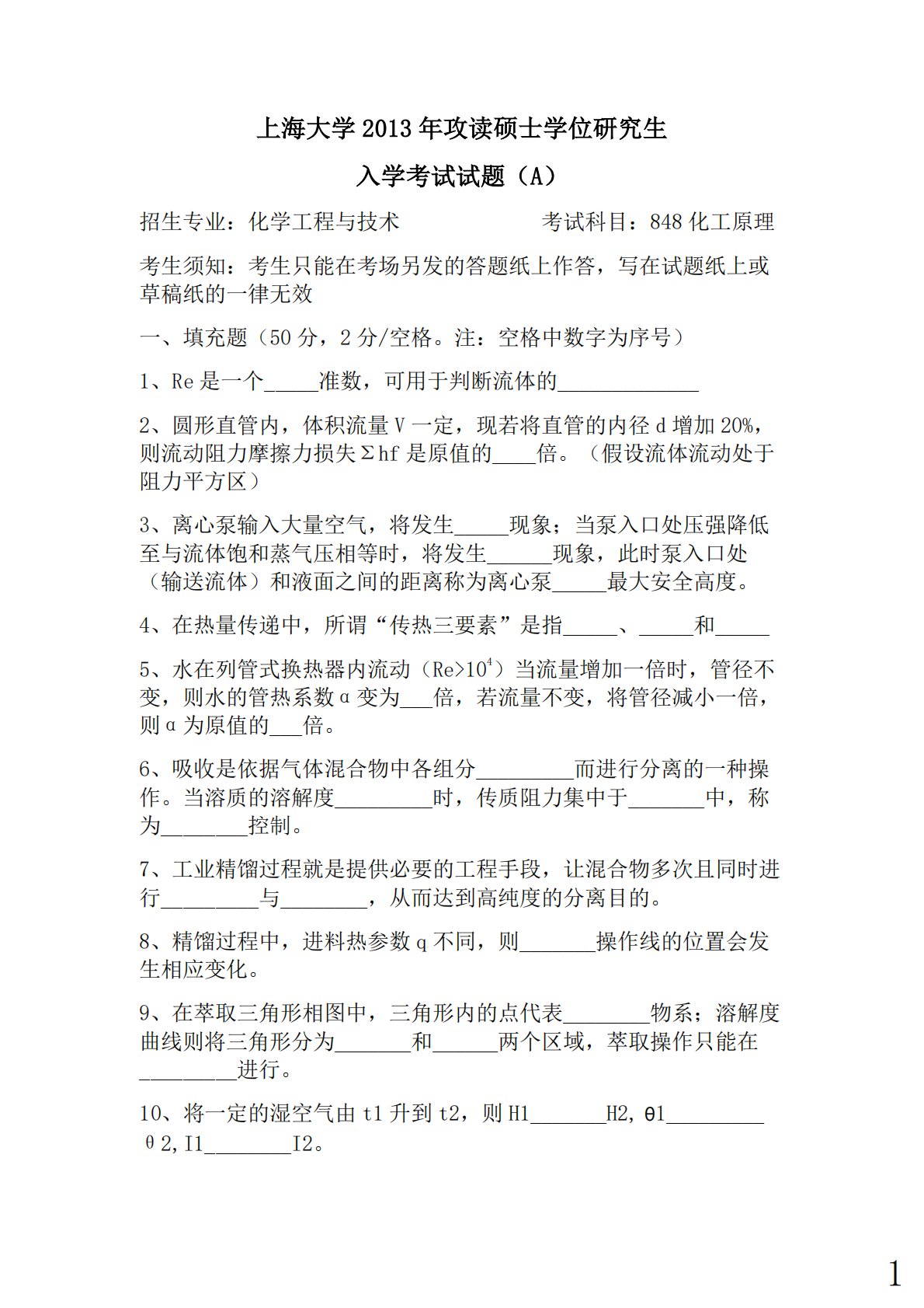 上海大学2013年攻读硕士学位研究生入学考试试题(A)招生专业:化学工程与技术考试科目:848化工原理考生须知:考生只能在考场另发的答题纸上作答,写在试题纸上或草稿纸的一律无效一、填充题(50分,2分/空格。注:空格中数字为序号)1、Re是一个_____准数,可用于判断流体的_____________2、圆形直管内,体积流量V一定,现若将直管的内径d增加20%,则流动阻力摩擦力损失Σhf是原值的____倍。(假设流体流动处于阻力平方区)3、离心泵输入大量空气,将发生_____现象;当泵入口处压强降低至与流体饱和蒸气压相等时,将发生______现象,此时泵入口处(输送流体)和液面之间的距离称为离...