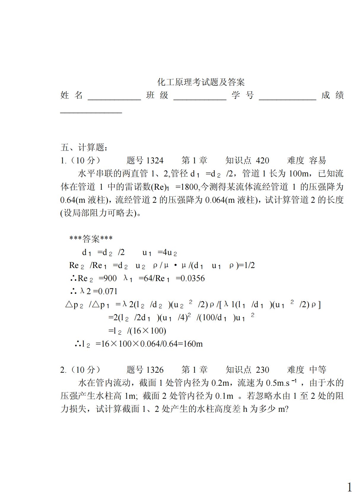 化工原理考试题及答案姓名____________班级____________学号_____________成绩______________五、计算题:1.(10分)题号1324第1章知识点420难度容易水平串联的两直管1、2,管径d=d/2,管道1长为100m,已知流体在管道1中的雷诺数(Re)=1800,今测得某流体流经管道1的压强降为0.64(m液柱),流经管道2的压强降为0.064(m液柱),试计算管道2的长度(设局部阻力可略去)。***答案***d=d/2u=4uRe/Re=duρ/μ·μ/(duρ)=1/2∴Re=900λ=64/Re=0.0356∴λ...
