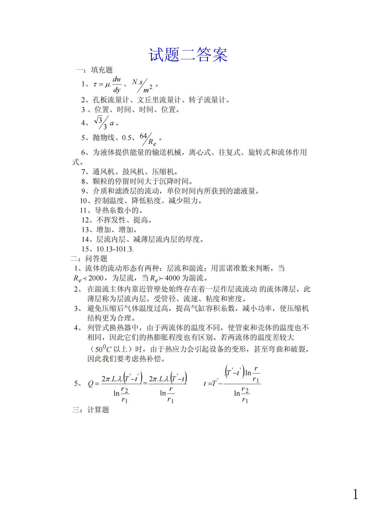 试题二答案一:填充题1、dydw.μτ=、2.msN。2、孔板流量计、文丘里流量计、转子流量计。3、位置、时间、时间、位置。4、a33。5、抛物线、0.5、eR64。6、为液体提供能量的输送机械,离心式、往复式、旋转式和流体作用式。7、通风机、鼓风机、压缩机。8、颗粒的停留时间大于沉降时间。9、介质和滤渣层的流动,单位时间内所获到的滤液量。10、控制温度、降低粘度、减少阻力。11、导热糸数小的。12、不挥发性、提高。13、增加、增加。14、层流内层、减薄层流内层的厚度。15、10.13-101.3.二:问答题1、流体的流动形态有两种:层流和湍流;用雷诺准数来判断,当2000peR,为层流,当4...