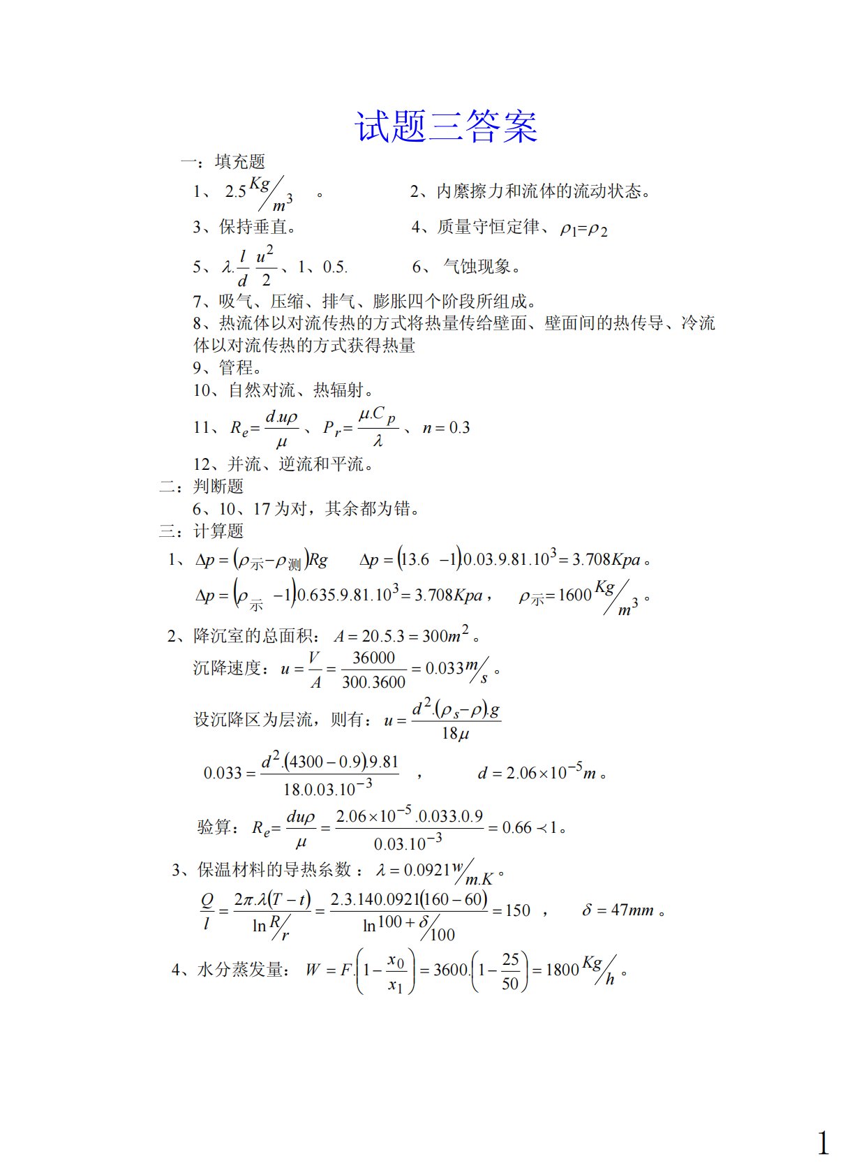 试题三答案一:填充题1、35.2mKg。2、内縻擦力和流体的流动状态。3、保持垂直。4、质量守恒定律、21ρρ=5、dl.λ22u、1、0.5.6、气蚀现象。7、吸气、压缩、排气、膨胀四个阶段所组成。8、热流体以对流传热的方式将热量传给壁面、壁面间的热传导、冷流体以对流传热的方式获得热量9、管程。10、自然对流、热辐射。11、μρudRe.=、λμprCP.=、3.0=n12、并流、逆流和平流。二:判断题6、10、17为对,其余都为错。三:计算题1、()Rgp测示ρρ−=Δ()Kpap708.310.81.9.03.0.16.133=−=Δ。()Kpap708.310.81.9.635.0.1...