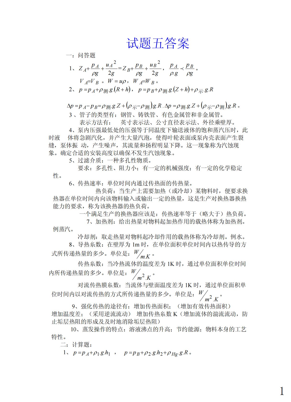 试题五答案一:问答题1、gugpZAAA22++ρ=gugpZBBB22++ρ,gpgpBAρρp.。BAVV=。ρuW=,BAWW=。2、()hRgppA++=..测ρ,()RghZgppB....示测ρρ+++=()RgZgpppBA....测示测ρρρ−+=−=Δ.()RgZgp....测示测ρρρ−+=Δ。3、管子的类型有:钢管、铸铁管、有色金属管和非金属管。表示方法有:英寸表示法、公寸直径表示法、外径乘壁厚。4、泵内压强最低处的压强等于同温度下输送液体的饱和蒸汽压时,此时液体将急剧汽化,并产生大量汽泡,使得叶轮表面或泵内壳表面产生裂缝,泵体振动,产生噪声,其流量和扬程明显下降。这一现...