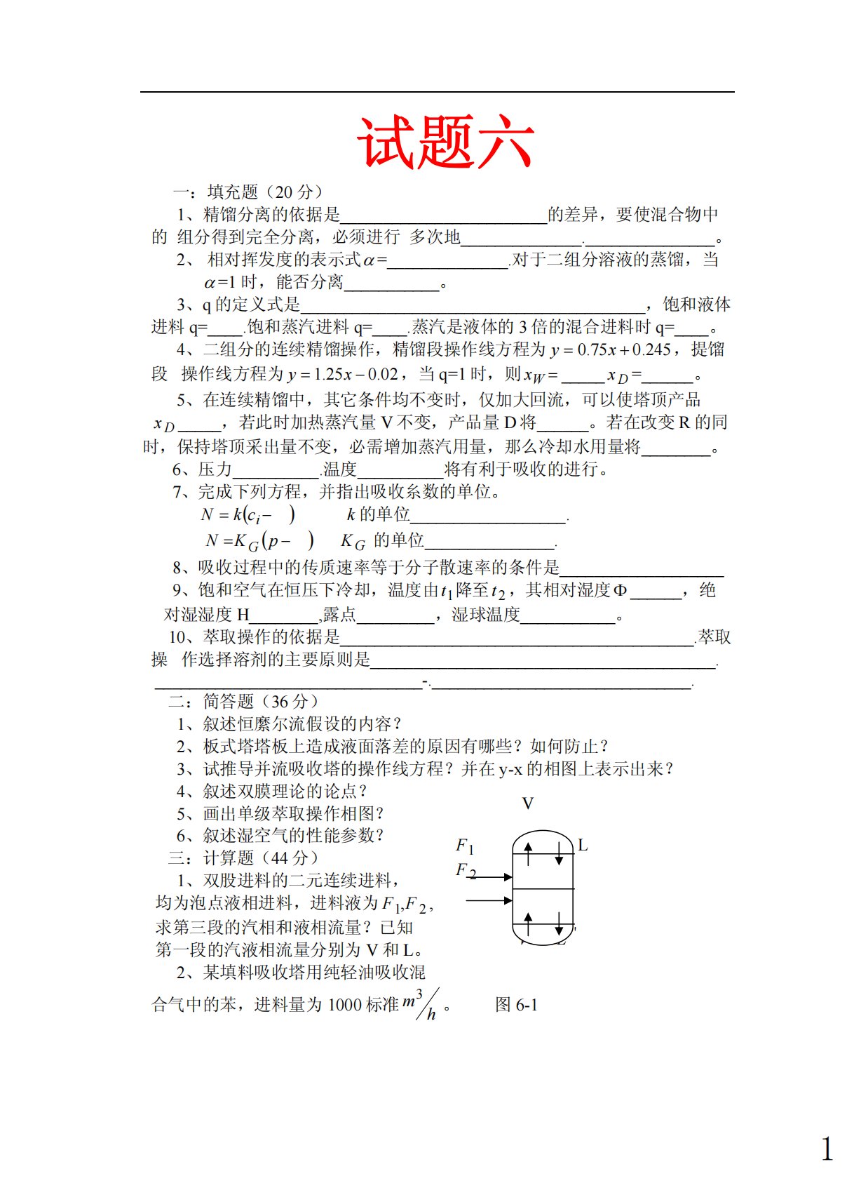 试题六一:填充题(20分)1、精馏分离的依据是________________________的差异,要使混合物中的组分得到完全分离,必须进行多次地______________._______________。2、相对挥发度的表示式α=______________.对于二组分溶液的蒸馏,当α=1时,能否分离___________。3、q的定义式是________________________________________,饱和液体进料q=____.饱和蒸汽进料q=____.蒸汽是液体的3倍的混合进料时q=____。4、二组分的连续精馏操作,精馏段操作线方程为245.075.0+=xy,提馏...
