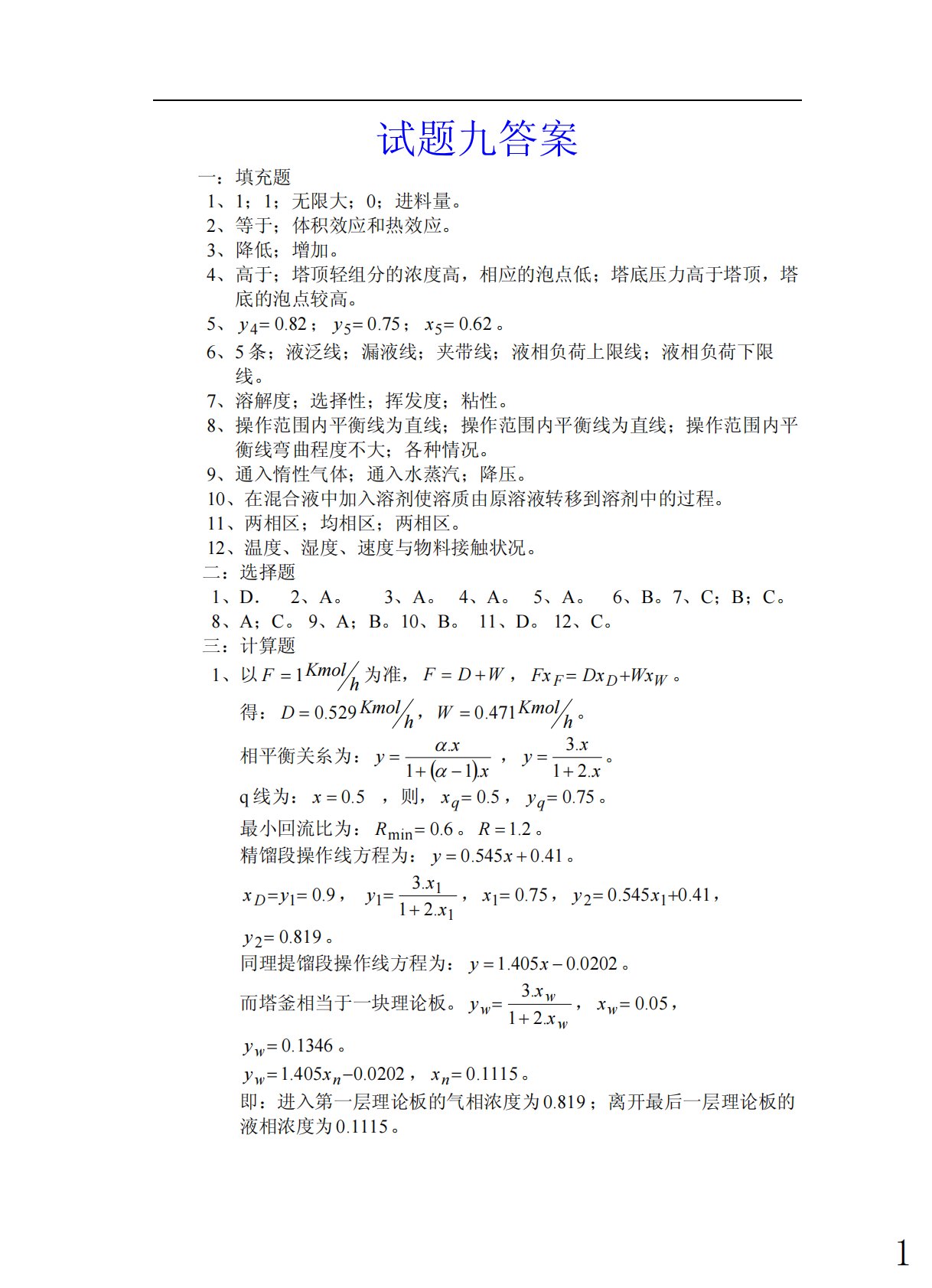 试题九答案一:填充题1、1;1;无限大;0;进料量。2、等于;体积效应和热效应。3、降低;增加。4、高于;塔顶轻组分的浓度高,相应的泡点低;塔底压力高于塔顶,塔底的泡点较高。5、82.04=y;75.05=y;62.05=x。6、5条;液泛线;漏液线;夹带线;液相负荷上限线;液相负荷下限线。7、溶解度;选择性;挥发度;粘性。8、操作范围内平衡线为直线;操作范围内平衡线为直线;操作范围内平衡线弯曲程度不大;各种情况。9、通入惰性气体;通入水蒸汽;降压。10、在混合液中加入溶剂使溶质由原溶液转移到溶剂中的过程。11、两相区;均相区;两相区。12、温度、湿度、速度与物料接触状况。二:选择题1、D.2...