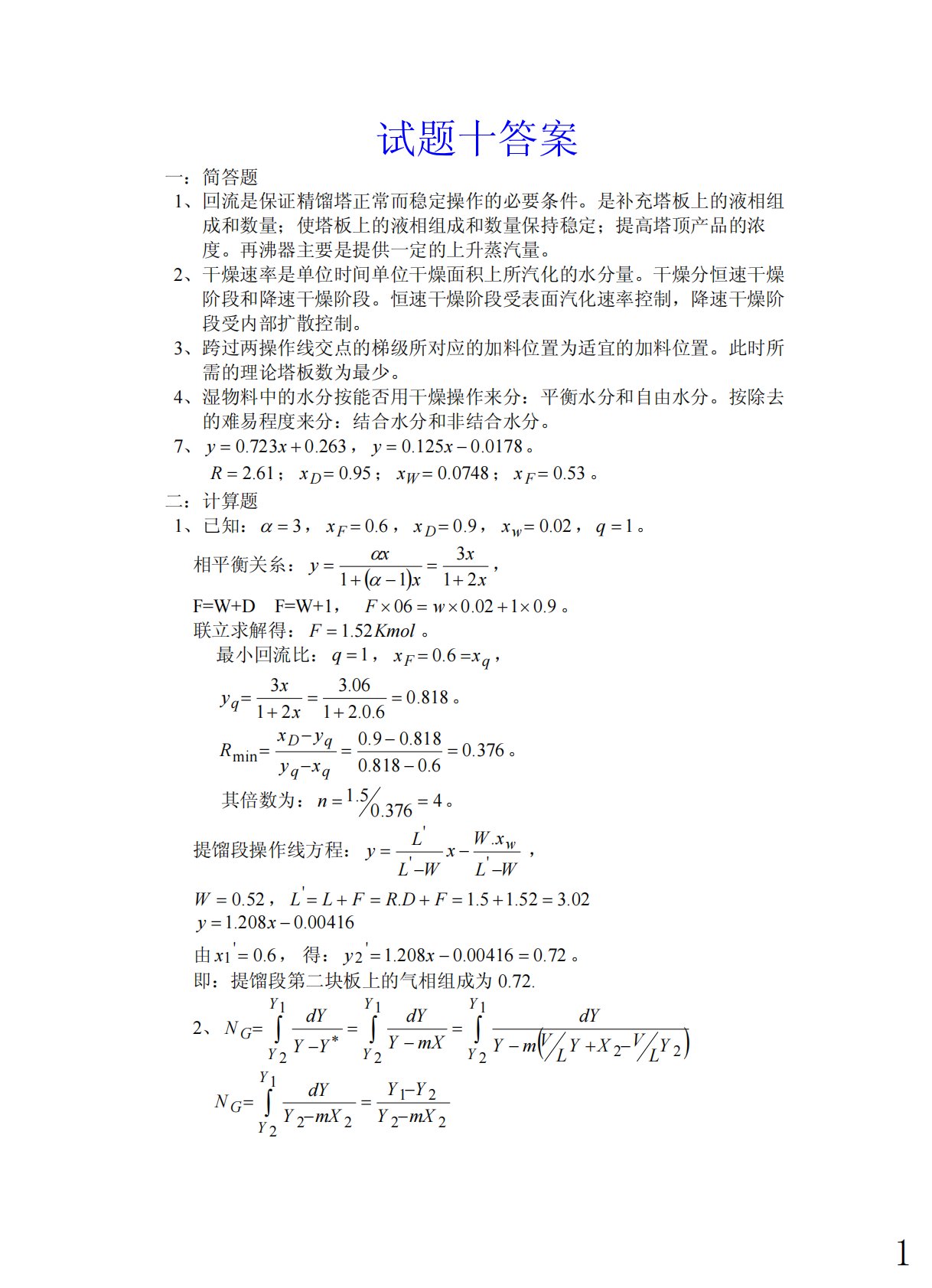 试题十答案一:简答题1、回流是保证精馏塔正常而稳定操作的必要条件。是补充塔板上的液相组成和数量;使塔板上的液相组成和数量保持稳定;提高塔顶产品的浓度。再沸器主要是提供一定的上升蒸汽量。2、干燥速率是单位时间单位干燥面积上所汽化的水分量。干燥分恒速干燥阶段和降速干燥阶段。恒速干燥阶段受表面汽化速率控制,降速干燥阶段受内部扩散控制。3、跨过两操作线交点的梯级所对应的加料位置为适宜的加料位置。此时所需的理论塔板数为最少。4、湿物料中的水分按能否用干燥操作来分:平衡水分和自由水分。按除去的难易程度来分:结合水分和非结合水分。7、263.0723.0+=xy,0178.0125.0−=xy。61.2=R...