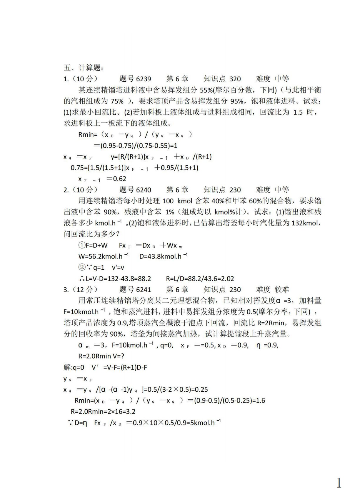 上海大学852化工原理蒸馏计算题