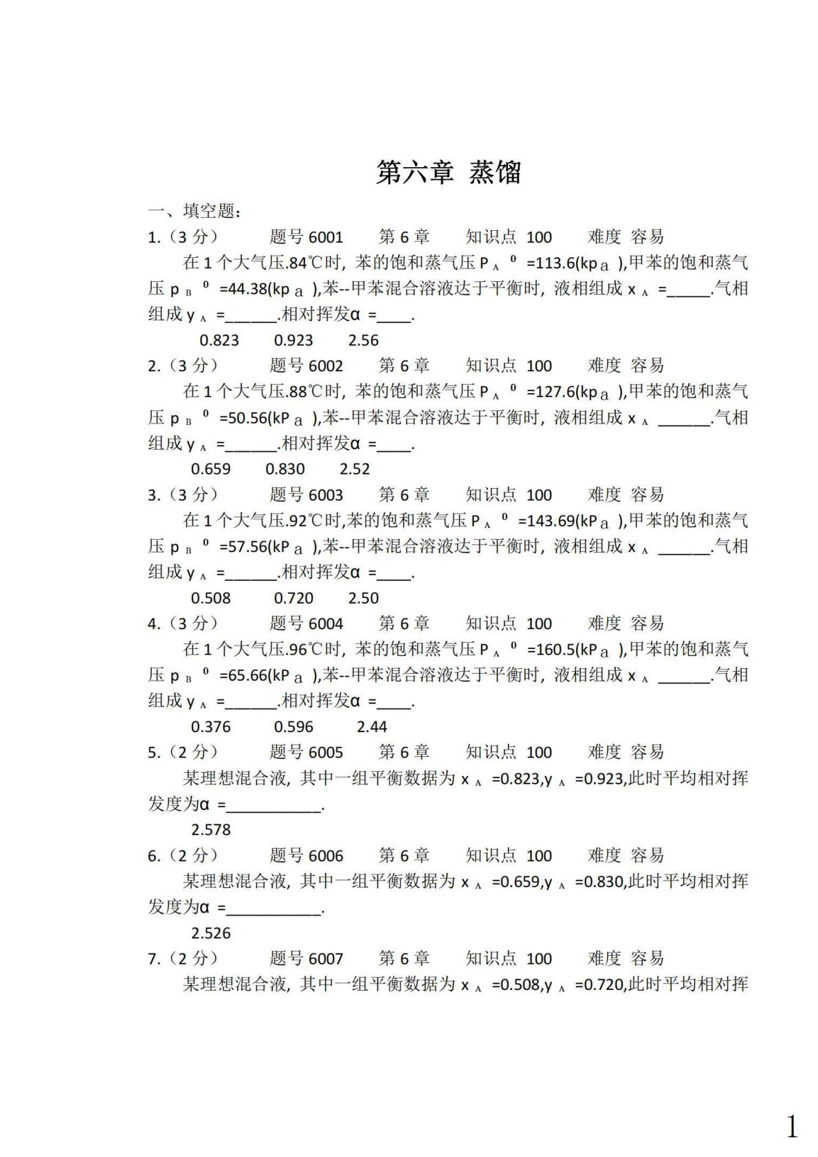 上海大学852化工原理蒸馏填空