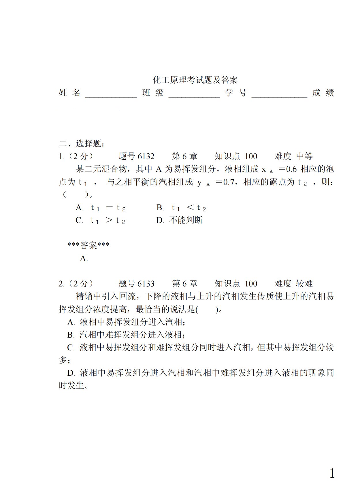 化工原理考试题及答案姓名____________班级____________学号_____________成绩______________二、选择题:1.(2分)题号6132第6章知识点100难度中等某二元混合物,其中A为易挥发组分,液相组成x=0.6相应的泡点为t,与之相平衡的汽相组成y=0.7,相应的露点为t,则:()。A.t=tB.t<tC.t>tD.不能判断***答案***A.2.(2分)题号6133第6章知识点100难度较难精馏中引入回流,下降的液相与上升的汽相发生传质使上升的汽相易挥发组分浓度提高,最恰当的说法是()。A.液相中易挥发组分进入汽相;B.汽相中难挥...