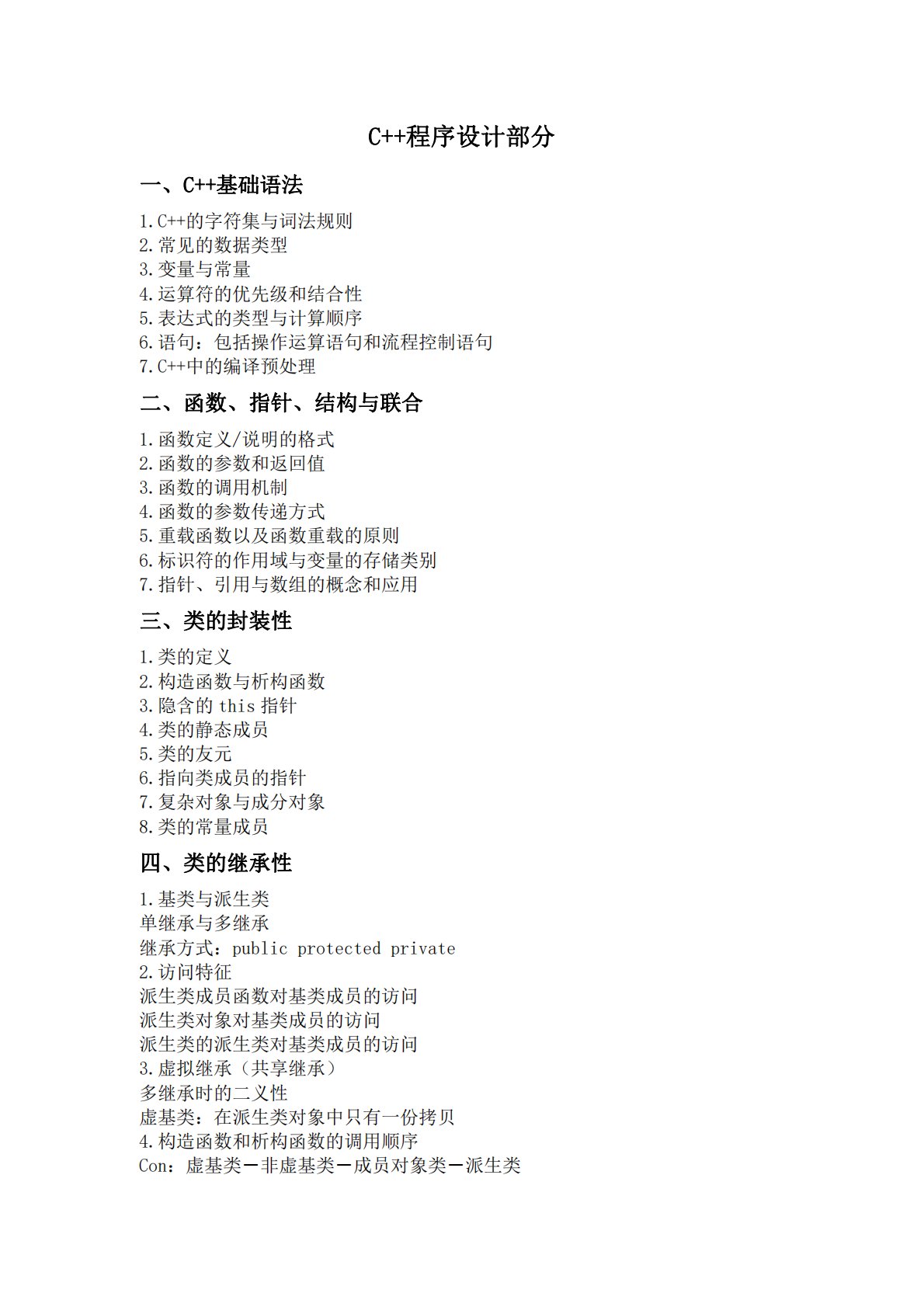 C++程序设计部分一、C++基础语法1.C++的字符集与词法规则2.常见的数据类型3.变量与常量4.运算符的优先级和结合性5.表达式的类型与计算顺序6.语句:包括操作运算语句和流程控制语句7.C++中的编译预处理二、函数、指针、结构与联合1.函数定义/说明的格式2.函数的参数和返回值3.函数的调用机制4.函数的参数传递方式5.重载函数以及函数重载的原则6.标识符的作用域与变量的存储类别7.指针、引用与数组的概念和应用三、类的封装性1.类的定义2.构造函数与析构函数3.隐含的this指针4.类的静态成员5.类的友元6.指向类成员的指针7.复杂对象与成分对象8.类的常量成员四、类的继承性1.基类与...
