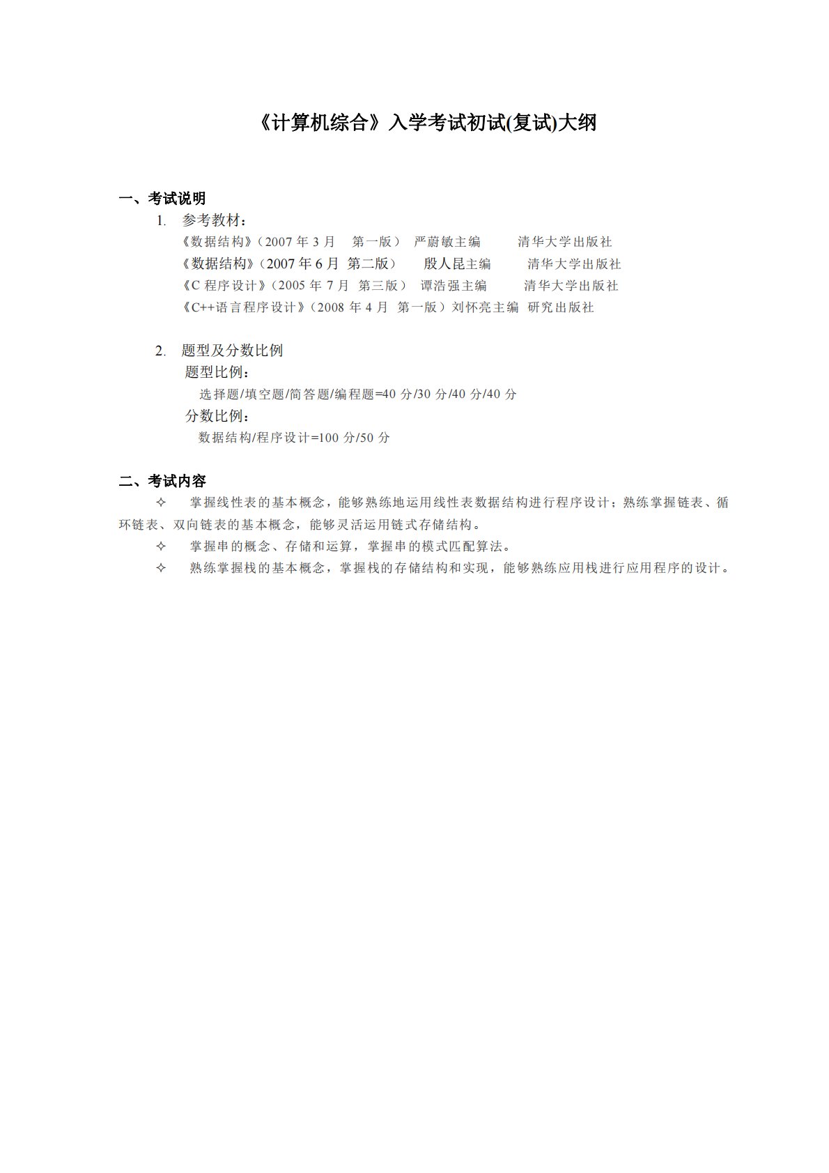 《计算机综合》入学考试初试(复试)大纲一、考试说明1.参考教材:《数据结构》(2007年3月第一版)严蔚敏主编清华大学出版社《数据结构》(2007年6月第二版)殷人昆主编清华大学出版社《C程序设计》(2005年7月第三版)谭浩强主编清华大学出版社《C++语言程序设计》(2008年4月第一版)刘怀亮主编研究出版社2.题型及分数比例题型比例:选择题/填空题/简答题/编程题=40分/30分/40分/40分分数比例:数据结构/程序设计=100分/50分二、考试内容掌握线性表的基本概念,能够熟练地运用线性表数据结构进行程序设计;熟练掌握链表、循环链表、双向链表的基本概念,能够灵活运用链式存储结构。...