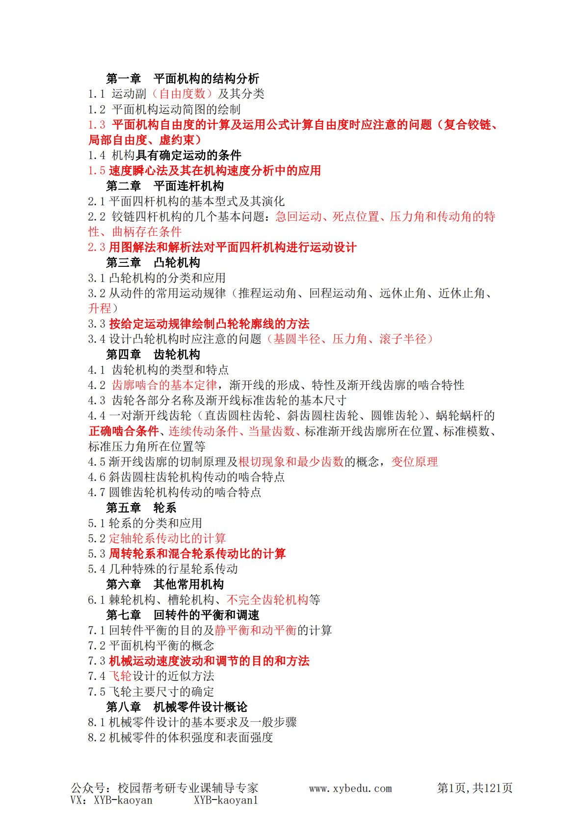 第一章平面机构的结构分析1.1运动副(自由度数)及其分类1.2平面机构运动简图的绘制1.3平面机构自由度的计算及运用公式计算自由度时应注意的问题(复合铰链、局部自由度、虚约束)1.4机构具有确定运动的条件1.5速度瞬心法及其在机构速度分析中的应用第二章平面连杆机构2.1平面四杆机构的基本型式及其演化2.2铰链四杆机构的几个基本问题:急回运动、死点位置、压力角和传动角的特性、曲柄存在条件2.3用图解法和解析法对平面四杆机构进行运动设计第三章凸轮机构3.1凸轮机构的分类和应用3.2从动件的常用运动规律(推程运动角、回程运动角、远休止角、近休止角、升程)3.3按给定运动规律绘制凸轮轮廓线的方法3.4...