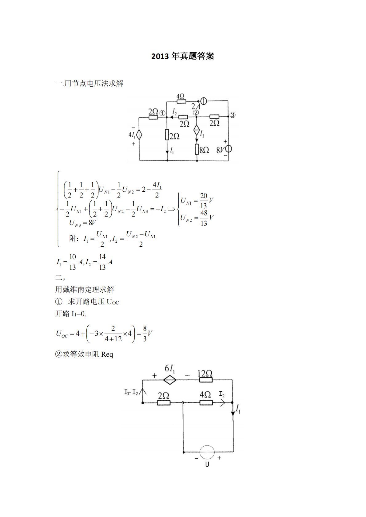 2013年真题答案一.用节点电压法求解二,用戴维南定理求解①求开路电压UOC开路I1=0,②求等效电阻Req==−===−=−++−−=−++VUVUUUIUIVUIUUUIUUNNNNNNNNNNN134813202,282121212124221212121211221132321121附:AIAI1314,131021==VUOC384124234=+−+=三.【分析】可先将三个60Ω的电阻做△-Y变换,如图当20V电压源单独作用时,当1A电流源单独作用时,()WRUPRRIIIURIIIIIIOCMAX4.049...