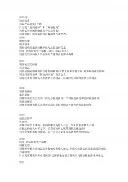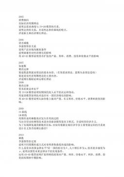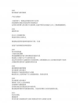 2005绝对地租与级差地租产权与债权*土地价格与一般商品价格的共性与区别价值规律在国际市场发挥作用的特征*运用资本积聚与资本集中关系原理,论述中国企业实施大公司、大集团战略路径。2006虚拟资本*社会主义初级阶段*简述信用的主要形式简述商品使用价值和价值的对立统一关系论述产业结构优化和高度化*2007资本有机构成土地经营权垄断简述超额剩余价值与相对剩余价值的关系简述收入分配中公平与效率的关系试运用实体资本与虚拟资本关系的原理。分析我国社会主义市场经济条件下如何正确处理实体经济与虚拟经济的关系2008通货膨胀和通货紧缩资本集聚与资本集中简述现代产权制度的特征与功能略论资本主义国有制产生与发展的原...