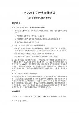 马克思主义经典著作选读《关于费尔巴哈的提纲》时代背景:费尔巴哈:德国哲学家(1804.7.28—1872.9.13)1.费尔巴哈人本学哲学,在唯物主义发展史上做出了贡献。他的思想的主要特点有:1用自然界代替存在,就排除了社会存在2用生物学上的人代替社会人的思维,排除了人的思维的社会性3把人的本质就视为生物学的本质2、费尔巴哈的宗教思想:(三个角度批判基督教)①揭露了基督教的本质,指出不是神创造了人而是人创造了神,上帝是人们按照自己的本质幻想出来的;人对上帝的崇拜,实际上是对人的本质的崇拜。②宗教产生的认识根源:人的认识能力和实践能力的局限③宗教的反动社会作用,指出宗教是科学的死敌(麻醉、蒙蔽)...