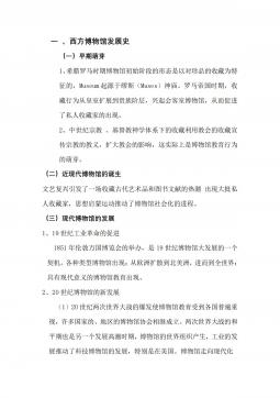 一、西方博物馆发展史(一)早期萌芽1、希腊罗马时期博物馆初始阶段的形态是以对珍品的收藏为特征的,Museum起源于缪斯(Muses)神庙。罗马帝国时期,收藏行为从皇室扩展到贵族阶层,兴起会客室博物馆,从而促进了私人收藏家的出现。2、中世纪宗教、基督教神学体系下的收藏利用教会的收藏宣传宗教的教义,扩大教会的影响,这实际上是博物馆教育行为的萌芽。(二)近现代博物馆的诞生文艺复兴引发了一场收藏古代艺术品和图书文献的热潮出现大批私人收藏家,思想启蒙运动推动了博物馆社会化的进程。(三)现代博物馆的发展1、19世纪工业革命的促进1851年伦敦万国博览会的举办,是19世纪博物馆大发展的一个契机。各种类型博物...