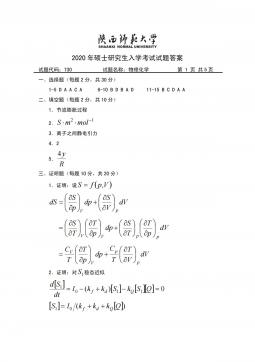 2020年硕士研究生入学考试试题答案试题代码:730试题名称:物理化学第1页共5页一、选择题(每题2分,共30分)1-5DAACA6-10BDBAD11-15BCDAA二、填空题(每题2分,共10分)1.节流膨胀过程2.12molmS3.离子之间静电引力4.25.Ry4三、证明题(每题10分,共20分)1.证明:设VpfS,dVVTTCdppTTCdVpTTSdppTTSdVVSdppSdSppVVppVVpV2.证明:对1S稳态近似...