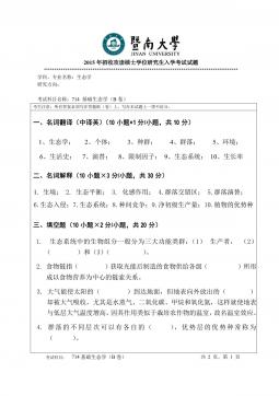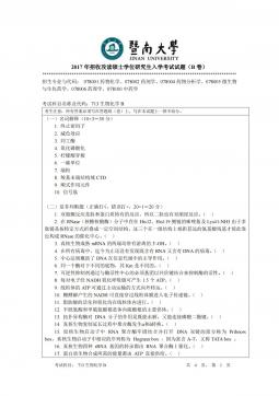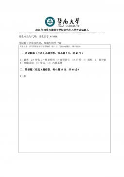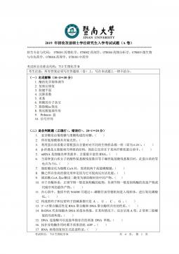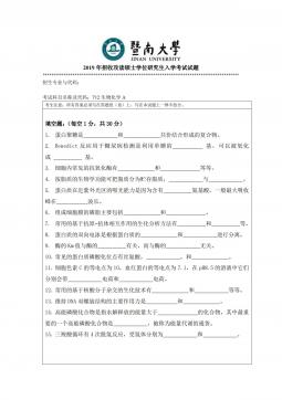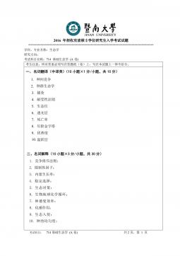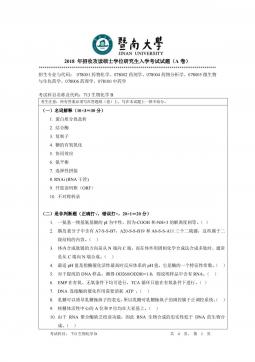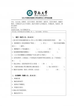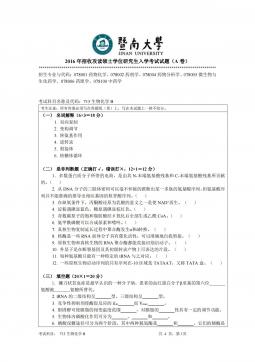 2016年招收攻读硕士学位研究生入学考试试题********************************************************************************************学科、专业名称:动物学、水生生物学、微生物学、遗传学、发育生物学、细胞生物学、生物化学与分子生物学、海洋生物学与生物技术、生物医药、免疫学、神经生物学研究方向:考试科目名称:712生物化学A考生注意:所有答案必须写在答题纸(卷)上,写在本试题上一律不给分。一、填空(每空2分,共40分)1.蛋白质中的氨基酸残基Ser和Cyt的R侧链上活泼的基团分别是()和()。2.脂肪酸...