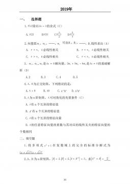 一、选择题1.f(x)除以2x3的余式(C)A.f(2)Bf(3)Cf(32)Df(23)2.向量组1,2,……,r可由1,2,……,s线性表出(A)A.rs,A必线性相关B.rs,A必线性相关C.rs,B必线性相关C.rs,B必线性相关3.1,2,3是AxB解向量,23k123是Ax0的基础解析(D)A.2B.3C.4D.54.A、B为正交矩阵,下列错误的是:A.ABB.ABC.1ABD.TAB5.A为n阶矩阵,A可对角化的充要条件(C)A.A有n个互异的特征值B.AT有n个互异的特征值C.A有n个互异的特征向量D.A的任意特征向量的重数与其...