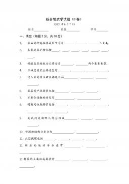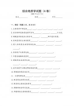 综合地质学2000年试题(A卷)一、名词解释(每题3分,共10个小题,共30分)1.角度不整合2.岩屑砂岩3.倾斜岩层走向4.剪应力5.纵弯褶皱作用6.逆冲推覆构造7.连续劈理8.花岗闪长岩9.片岩10.极射赤平投影二、简述题(每小题10分,共20分)1.简述张节理与剪节理的区别(10分)2.简述沉积环境的主要判别标志(10分)综合地质学2000年试题(A卷)一、名词解释(每题3分,共10个小题,共30分)1.角度不整合2.岩屑砂岩3.倾斜岩层走向4.剪应力5.纵弯褶皱作用6.逆冲推覆构造7.连续劈理8.花岗闪长岩9.片岩10.极射赤平投影二、简述题(每小题10分,共20分)1.简述张节理与剪...