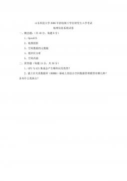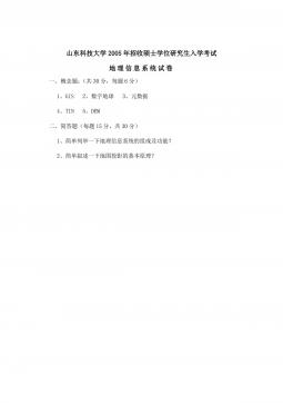 山东科技大学2005年招收硕士学位研究生入学考试地理信息系统试卷一、概念题:(共30分,每题6分)1、GIS2、数字地球3、元数据4、TIN5、DEM二、简答题(每题15分,共30分)1、简单列举一下地理信息系统的组成及功能?2、简单叙述一下地图投影的基本原理?山东科技大学2005年招收硕士学位研究生入学考试地理信息系统试卷一、概念题:(共30分,每题6分)1、GIS2、数字地球3、元数据4、TIN5、DEM二、简答题(每题15分,共30分)1、简单列举一下地理信息系统的组成及功能?2、简单叙述一下地图投影的基本原理?三、论述一下栅格数据模型和矢量数据模型的优缺点,以及由矢量数据向栅格数据转换...