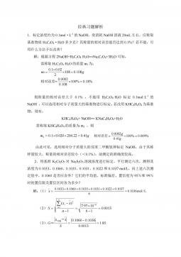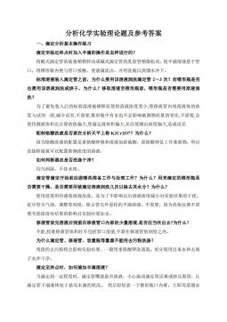 分析化学实验理论题及参考答案一、滴定分析基本操作练习滴定至临近终点时加入半滴的操作是怎样进行的?将酸式滴定管的旋塞稍稍转动或碱式滴定管的乳胶管稍微松动,使半滴溶液悬于管口,将锥形瓶内壁与管口接触,使液滴流出,并用洗瓶以蒸馏水冲下。标准溶液装入滴定管之前,为什么要用该溶液润洗滴定管2~3次?而锥形瓶是否也需用该溶液润洗或烘干,为什么?移取溶液至锥形瓶前,锥形瓶是否需要用原液润洗?为了避免装入后的标准溶液被稀释而使得溶液浓度变小,使移液管内残留液体的浓度与试剂一致,减少误差;不需要,锥形瓶中有水也不会影响被测物质量的变化;不需要,会使待测液体积比计算的值偏大,使滴定液体积偏大,从而使测出浓度偏大,...
