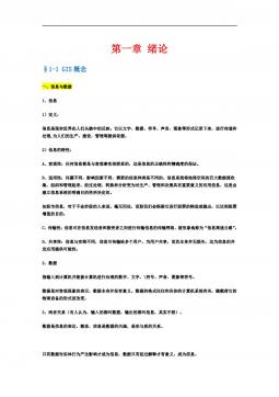 第一章绪论§1-1GIS概念一、信息与数据1、信息1)定义:信息是现实世界在人们头脑中的反映。它以文字、数据、符号、声音、图象等形式记录下来,进行传递和处理,为人们的生产,建设,管理等提供依据。2)信息的特性:A、客观性:任何信息都是与客观事实相联系的,这是信息的正确性和精确度的保证。B、适用性:问题不同,影响因素不同,需要的信息种类是不同的。信息系统将地理空间的巨大数据流收集,组织和管理起来,经过处理、转换和分析变为对生产、管理和决策具有重要意义的有用信息,这是由建立信息系统的明确目的性所决定的。如股市信息,对于不会炒股的人来说,毫无用处,而股民们会根据它进行股票的购进或抛出,以达到股票增值...