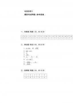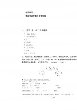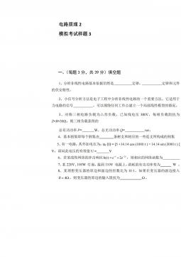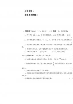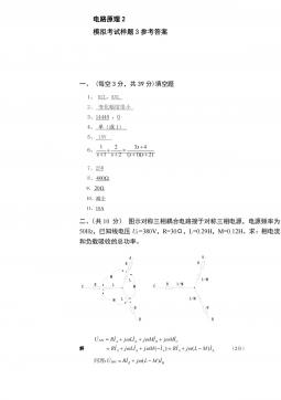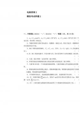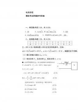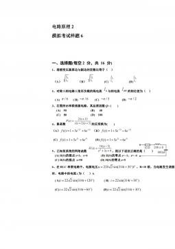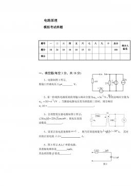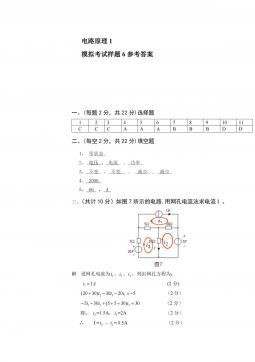 电路原理1模拟考试样题6参考答案一、(每题2分,共22分)选择题1234567891011CCCAAABBBDD二、(每空2分,共22分)填空题1、零状态2、电压、电流、功率3、不变、不变,减少,减少4、20005、66,4三、(共计10分)如图7所示的电路,用网孔电流法求电流I。解设网孔电流为1i、2i、3i,列出网孔方程为:Ai11(2分)52030)3020(132iii(2分)30)3055(305321iii(2分)得:2i=1.5A,3i=2A(2分)∴I=3i-2i=0.5A(2分)四、如图8所示电路,开关原合在位置1,t=0时开关由位置1合向2,求t≥0...