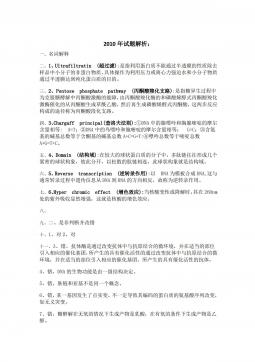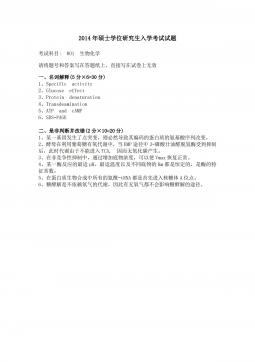 2014年硕士学位研究生入学考试试题考试科目:801生物化学请将题号和答案写在答题纸上,直接写在试卷上无效一、名词解释(5分×6=30分)1、Specificactivity2、Glucoseeffect3、Proteindenaturation4、Transdeamination5、ATPandcAMP6、SDS-PAGE二、是非判断并改错(2分×10=20分)1、某一基因发生了点突变,则必然导致其编码的蛋白质的氨基酸序列改变。2、酵母在利用葡萄糖有氧代谢中,当EMP途径中3-磷酸廿油醛脱氢酶受到抑制后,此时代谢由于不能进入TCA,因而无氧化碳产生。3、在非竞争性抑制中,通过增加底物浓度,可...