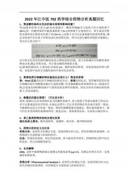 2022年江中医702药学综合药物分析真题回忆1、简述酸性染料比色法的基本原理和影响因素?答:(1)基本原理:在适当pH的水溶液中,碱性药物(B)可与氢离子结合成阳离子(BH+),而一些酸性染料可解离成阴离子(In-);两种离子定量地结合,即生成具有吸收光谱明显红移的有色离子对(BH+In-),该离子对可以定量地被有机溶剂萃取,测定有机相中有色离子对特征波长处的吸光度,即可以进行碱性药物的含量测定。其反应示意式如下:也可将呈色的有机相经碱化(如加人醇制氢氧化钠),使与有机碱结合的酸性染料释放出来,测定其吸光度,再计算出碱性药物的含量。(2)影响因素较多,主要包括:水相的pH、酸性染料的种类、有...