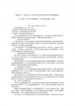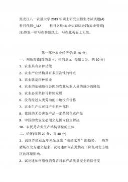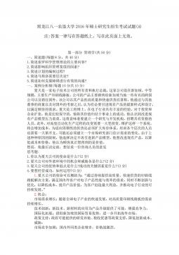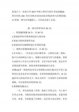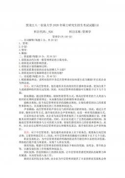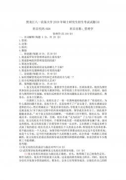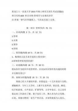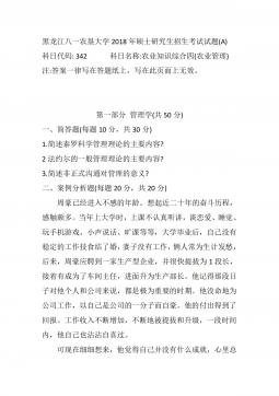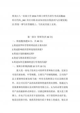 黑龙江八一农垦大学2014年硕士研究生招生考试试题(A)科目代码:342科目名称:农业知识综合四(农村与区域发展)注:答案一律写在答题纸上,写在此页面上无效。第一部分:管理学(50分)一、名词解释(每个3分,共12分)1.管理2.ERP3.激励4.决策二、简答题(每小题5分,共15分)1.简要回答集权与分权的关系。2.目标管理的基本思想与特点有哪些?3.清人顾嗣协在《杂兴》诗中写道:"骏马能历险,梨田不如牛。坚车能载重,渡河不如舟。舍长以就矩,智者难为谋。生才贵适用,慎勿多苛求。”请问这首诗说明了哪方面的、怎样的道理?三、论述题(23分)如何理解管理是科学性与艺术性的结合与统一?第二部分:农业...