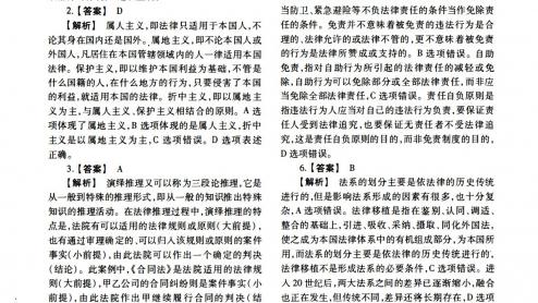 专业综合课一、单项选择题1.【答案】D【解析】自然法学派主张法是人的理性,强调自然法普遍永恒,且高于人定法,人定法符合自然法时才是真正的法律。自然法学派考虑价值因素,分析法学派主张在法学研究中不必考虑价值因素,AC选项混淆了自然法学派和分析法学派的观点,AC选项错误。反对任何超越现行法律文本的解释应为分析法学派的观点,B选项错误。历史法学派主张法律是民族精神的体现,D选项正确。2.【答案】D【解析)属人主义,即法律只适用于本国人,不论其身在国内还是国外。属地主义,即不论本国人或外国人,凡居住在本国管辖领域内的人一律适用本国法律。保护主义,即以维护本国利益为基础,不管是什么国籍的人,在什么地方的...