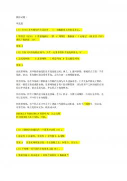 模拟试题:单选题:1.调制解调器从网络或传输线上接收传来的模拟信号并将其转换成数字位串需用()。A.信宿B.发送器C.传输系统D.接收器答案:D2.来自上一层的数据和控制信息的数据的结合称为(D)。A.协议B.信宿地址C.服务访问点D.协议数据单元答案:D3.利用各种通信手段,把地理上分散的计算机有机地连在一起,达到相互通信而且共享硬件、软件和数据等的系统属于(A)。A.计算机网络B.终端分时系统C.分布式计算机系统D.多机系统答案:A4.下列的提法中哪种是不正确的。(B)A.LAN在地理范围上比WAN要小B.LAN在速率上与WAN基本相同C.LAN在速率比上WAN要快D.多处理机系统在距离上...