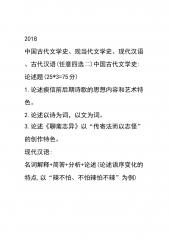 2018中国古代文学史、现当代文学史、现代汉语、古代汉语(任意四选二)中国古代文学史:论述题(25*3=75分)1.论述瘐信前后期诗歌的思想内容和艺术特色。2.论述以诗为词,以文为词。3.论述《聊斋志异》以“传寄法而以志怪”的创作特色。现代汉语:名词解释+简答+分析+论述(论述语序变化的特点,以“辣不怕、不怕辣怕不辣”为例)百校文库—海量高校资料共享库百校文库是一个线上大学生专业学习资料共享平台,致力于通过用户自主上传与分享,打造一个涵盖各大高校、各学科门类的免费资源中心。平台已积累50万+套历年真题与100万+条学习文档,覆盖绝大多数高校专业,所有资料均由各大高校学生自主上传。✅资料透明,直...