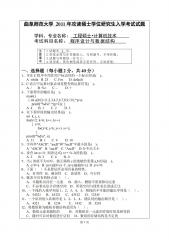 曲阜师范大学2011年攻读硕士学位研究生入学考试试题学科、专业名称:工程硕士•计算机技术考试科目名称:程序设计与数据结构注意事项1.试题共3页。2.答案必须写在答题纸上,写明题号,不用抄题。3.试题与答题纸一并交上。4.须用蓝、黑色钢笔或签字笔作答,字迹清楚。一、选择题(每小题2分,共40分)1、可在C程序中用作用户标识符的一个标识符是()。A.whileB.23C.ForD.default2、C语言中运算对象必须是整型的运算符是()。A./B.%=C.-D.+3、下面程序的输出是()。main(){inta[10]={1,2,3,4,5,6,7,8,9,10},*p=a;printf("%d...